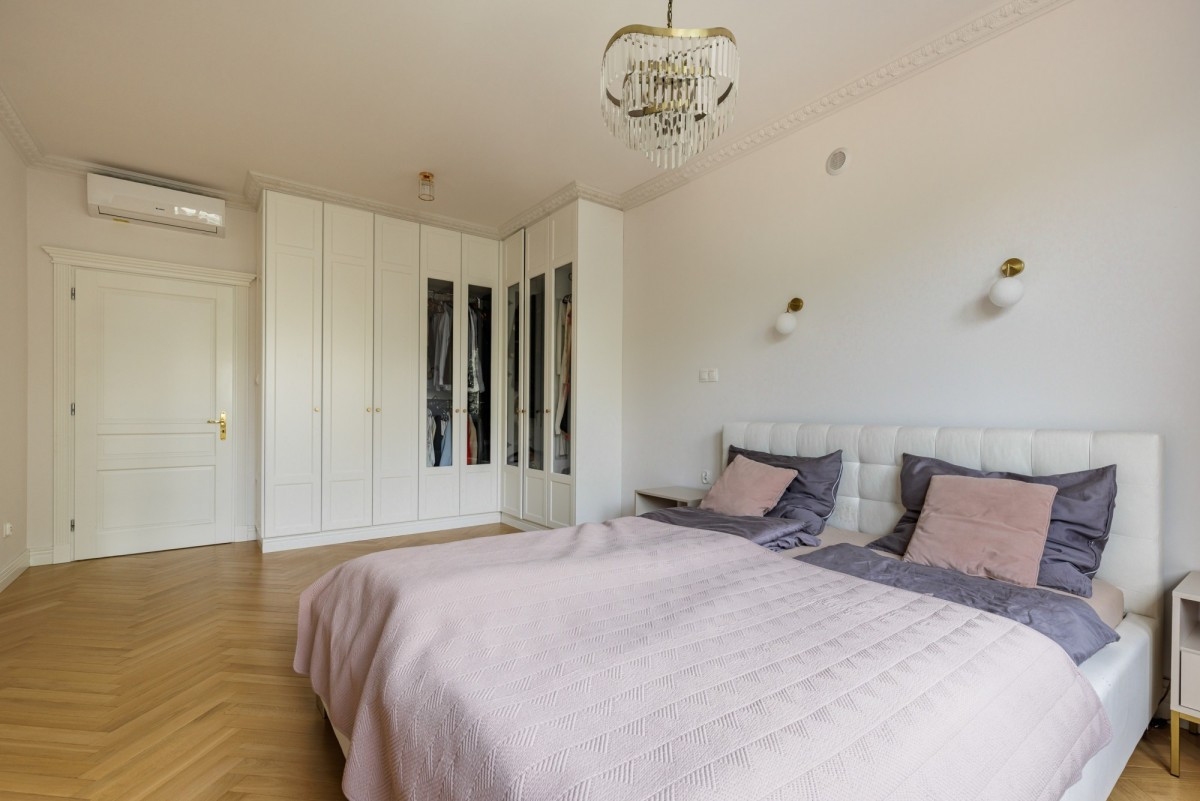 Apartament o powierzchni 121,36 m2 na jednym poziomie, oferuje przestronne i doskonale rozplanowane wnętrze. Duża, pięknie doświetlona strefa dzienna składa się z otwartej kuchni na strefę jadalnianą i salon, w którym znajduję się klimatyczny panel kominkowy. Część prywatna to sypiania master z obszerną szafą