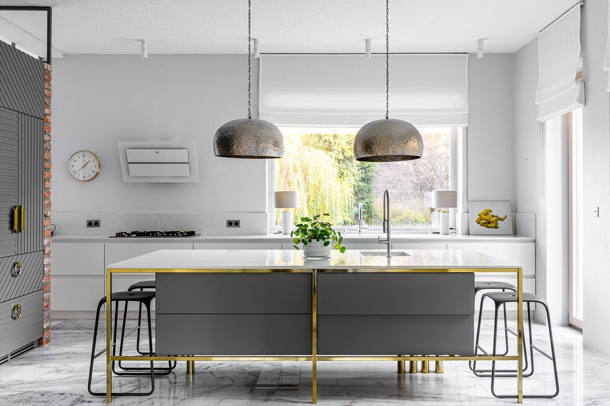 Nowoczesna zabudowa kuchni, z biżuteryjnymi dodatkami w kolorze złota, industrialne elementy wykończenia stropu oraz ściana z surowej cegły (ocalona z oryginalnego budynku) to tylko niektóre elementy podkreślające indywidualny charakter rezydencji.