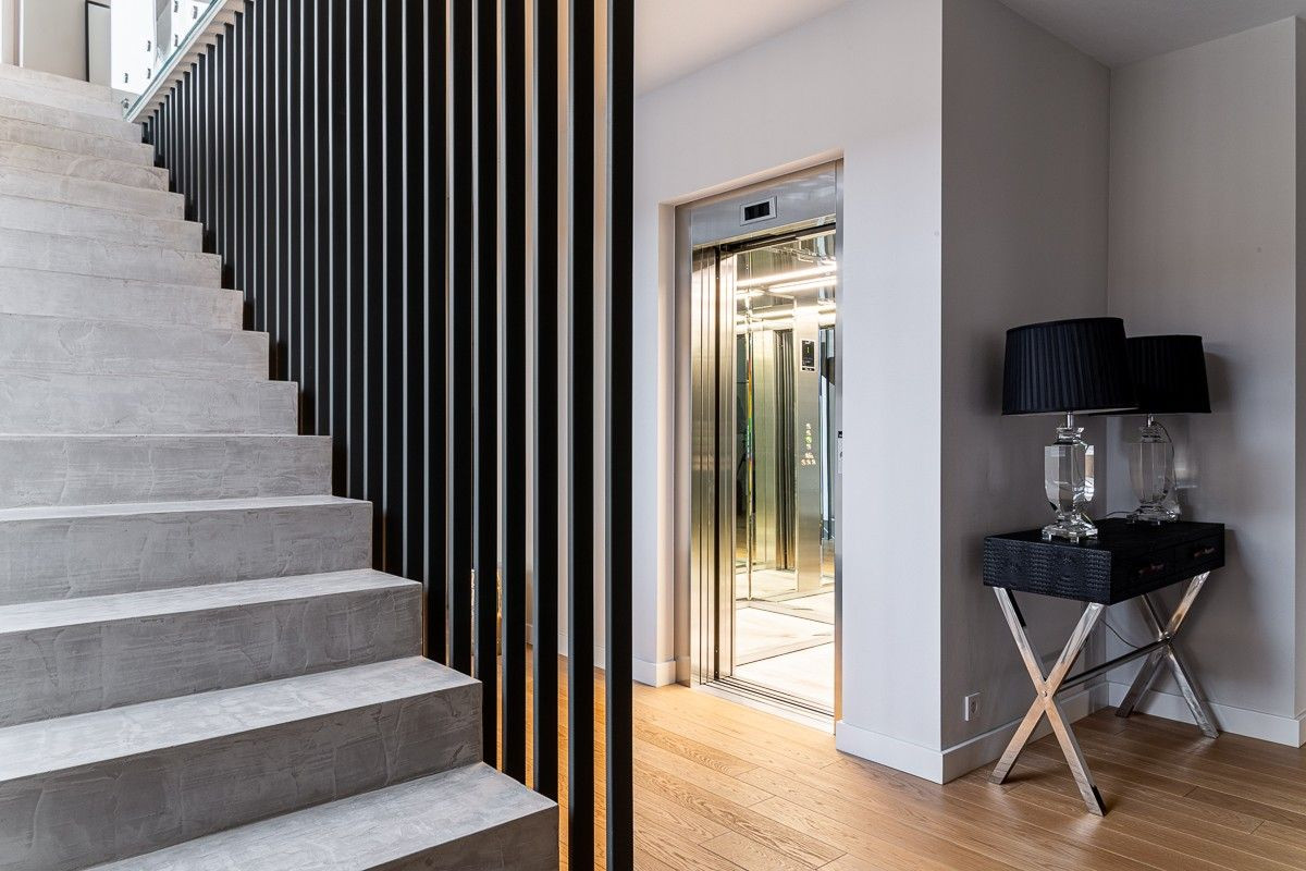Klatka schodowa to właściwie nowoczesna rzeźba z surowego betonu. Przeszklona, lustrzana winda łączy wszystkie poziomy domu.