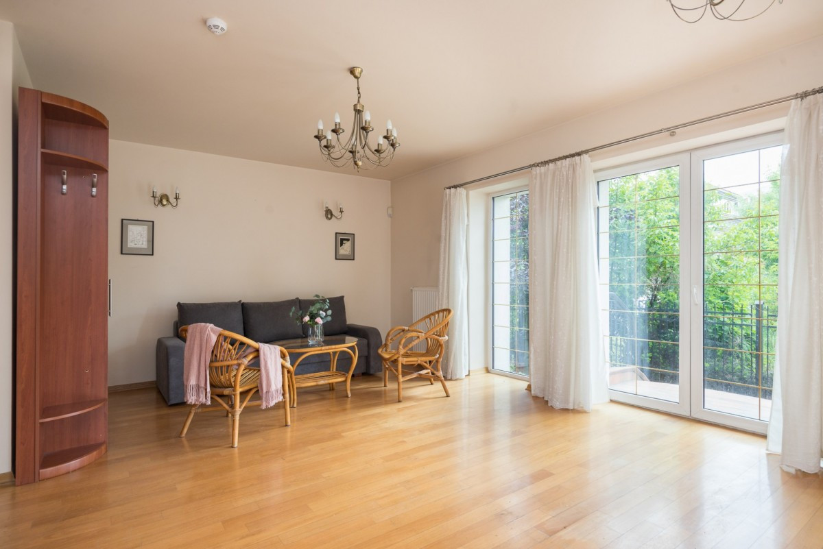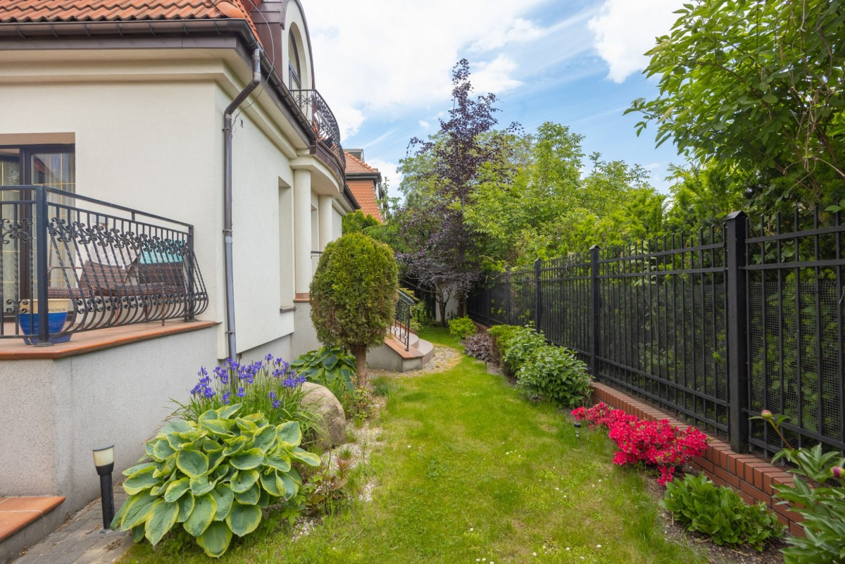 Wokół domu jest urządzony ogród z automatyczną instalacją do podlewania. Na parterze budynku od południowo - wschodniej strony znajduje się salon z wyjściem na ogród z jednej strony oraz z wyjściem na taras i ogród z drugiej strony. W salonie jest miejsce (i odpowiedni komin) na zainstalowanie kominka.