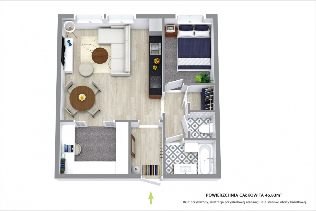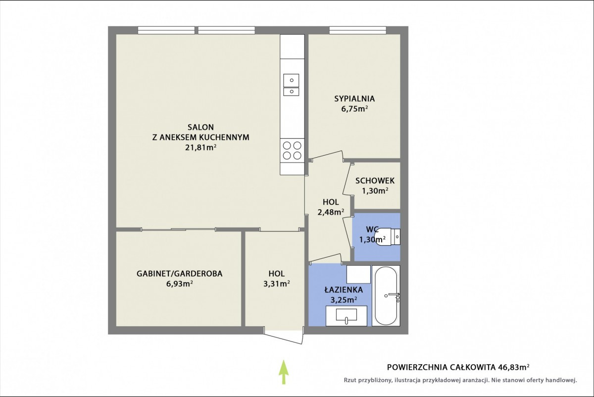 - Funkcjonalny układ - przestronny salon z aneksem kuchennym (21,80 m²), sypialnia (6,75 m²), łazienka z wanną i prysznicem (3,25 m²), oddzielna toaleta (1,3 m²), praktyczne pomieszczenie gospodarcze (1,3 m²) oraz dodatkowe, duże pomieszczenie (6,93 m²), które może pełnić funkcję garderoby, gabinetu lub drugiej sypialni.