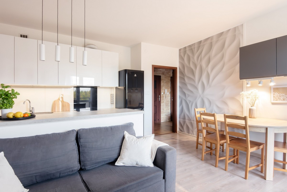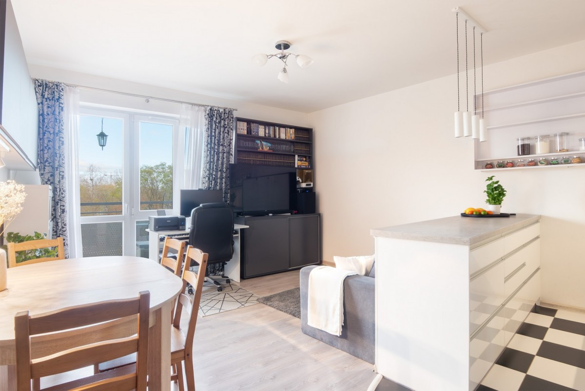 Jasne dwupokojowe mieszkanie o powierzchni 47m2 z aneksem kuchennym z wyspą i dużym balkonem z wyjściem z obu pokoi. Widok na drzewa i Eko Park, tworząc wyjątkowo relaksującą atmosferę. Sąsiedztwo to sympatyczne rodziny z dziećmi i młodzi dorośli.