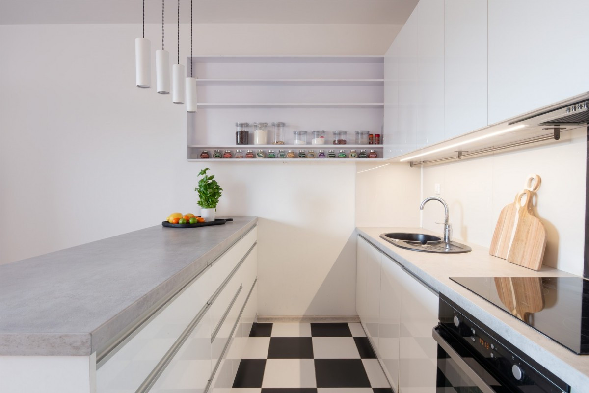 Salon z otwartą kuchnią z aneksem kuchennym z wyspą