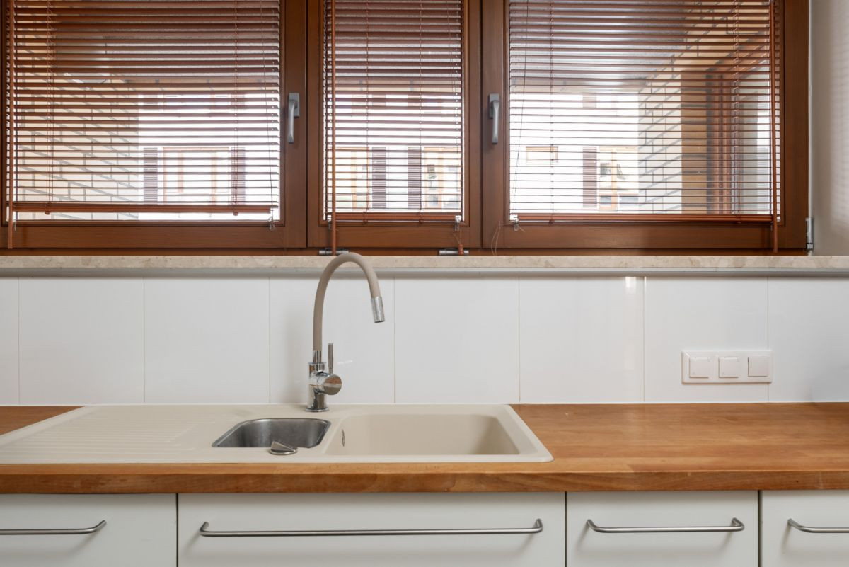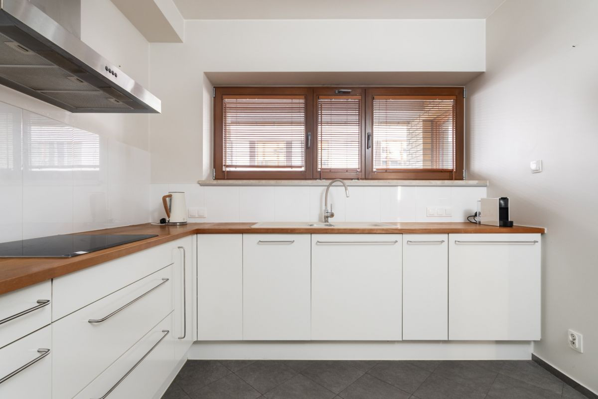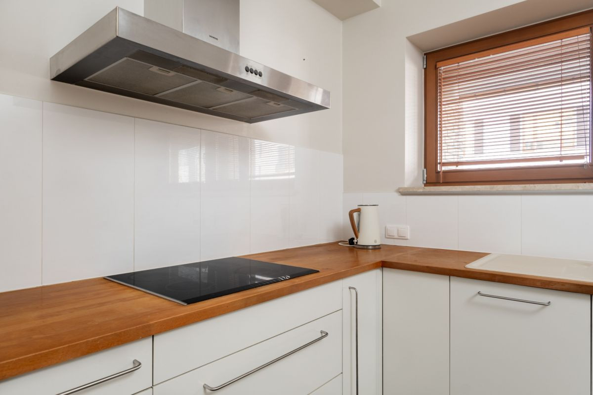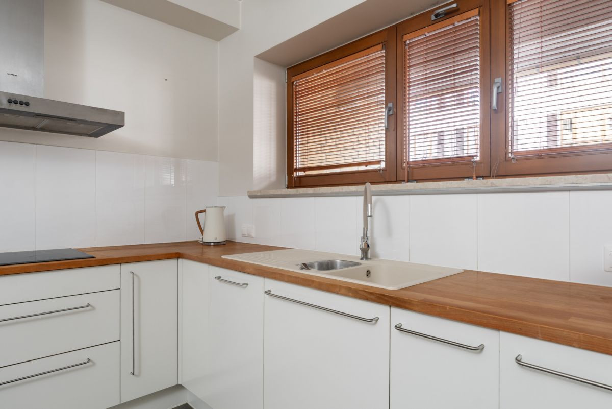 * oddzielna kuchnia oferuje sporą ilość drewnianego blatu roboczego oraz wszystkie niezbędne sprzęty AGD ukryte w estetycznej zabudowie. Funkcjonalna przestrzeń dla miłośników gotowania, którą można zupełnie odseparować od salonu.