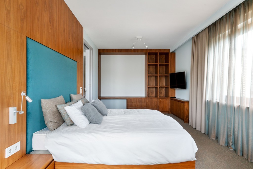 wygodna sypialnia z dużym łóżkiem i wezgłowiem z egzotycznego drewna