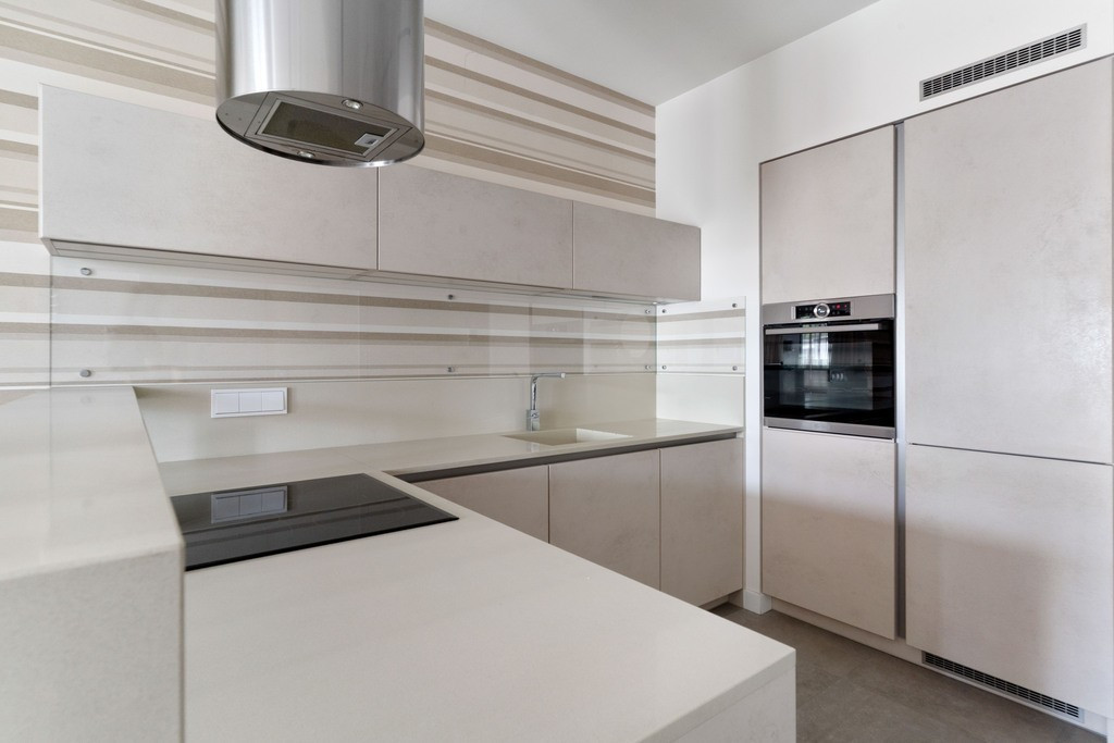 kuchnia wykończona spiekami kwarcowymi, blat z naturalnego granitu