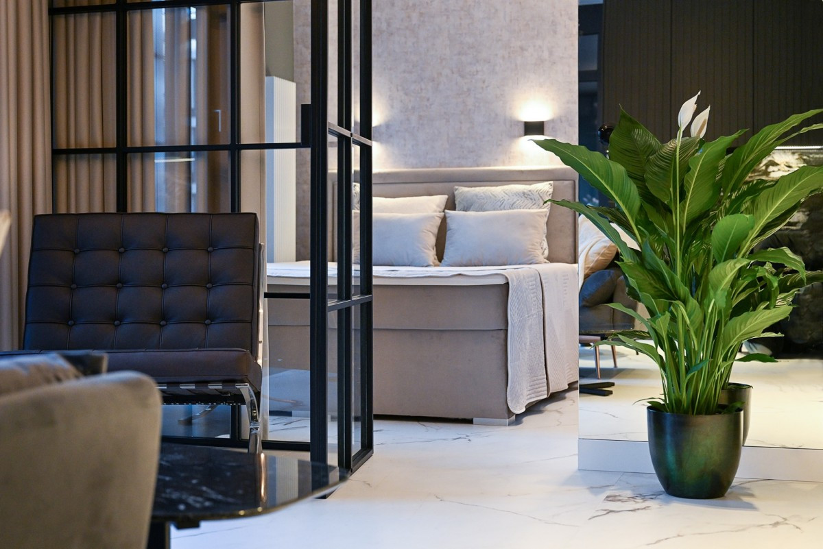 - salonu z dużymi oknami i wyjściem na balkon, który jest wyposażony w klimatyzację, ogrzewanie podłogowe i elektryczne zasłony,