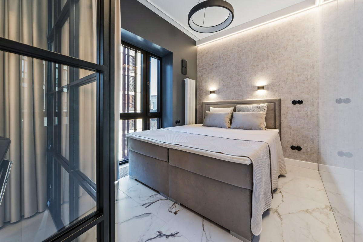 - sypialnię, oddzieloną szklanymi drzwiami w stylu "loft" z szafami w zabudowie i elektrycznymi zasłonami; w sypialni znajduje się duże łóżko sypialniane 160x200 ze schowkiem na pościel