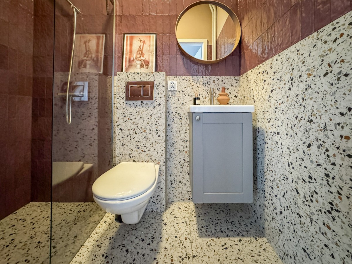 Na pierwszym piętrze czeka świeżo odnowione mieszkanie - dwa pokoje, kuchnia połączona z salonem, okna wychodzące na południowy zachód, dzięki czemu popołudniowe światło wpada do środka miękko i ciepło, jakby celowo trochę dłużej zostawało na kawę przy stole.