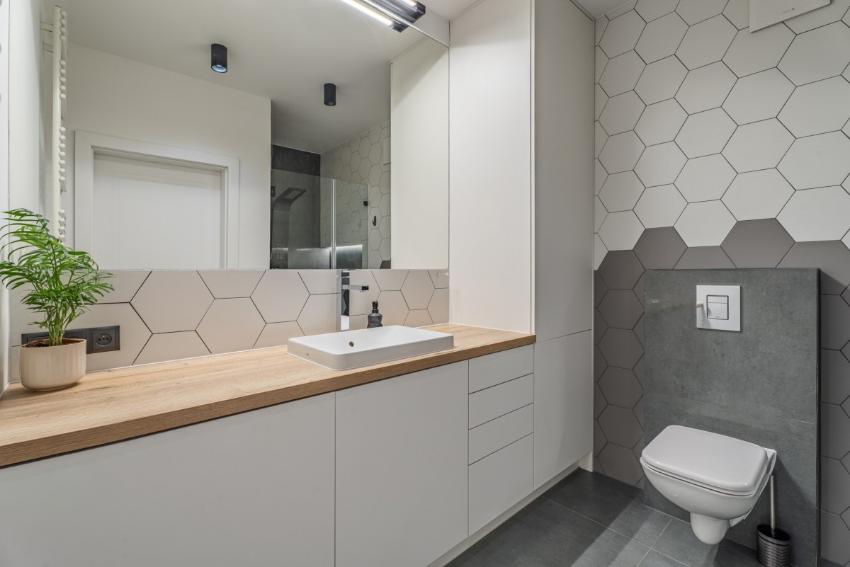 - łazienka z kabiną przysznicową, szafkami w zabudowie , pralką;