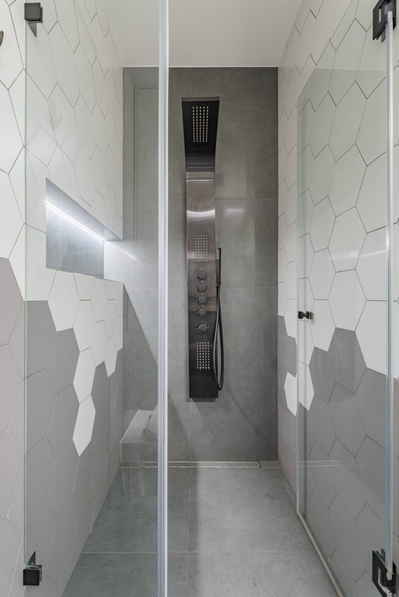 - bathroom with shower cabin, built-in cabinets, washing machine;