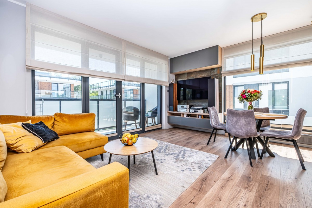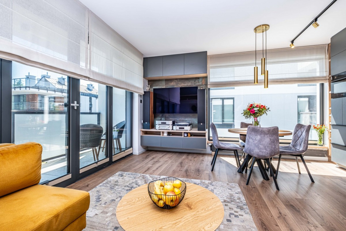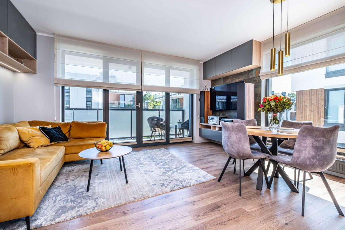 Piękne, nowocześnie zaprojektowane 3-pokojowe mieszkanie na kameralnym, ekskluzywnym osiedlu Bliżej Gwiazd przy ulicy Mehoffera, Tarchomin, (Nowodwory). Mieszkanie wykończono materiałami o wysokim standardzie oraz zainstalowano klimatyzację z 2 jednostkami wewnętrznymi.