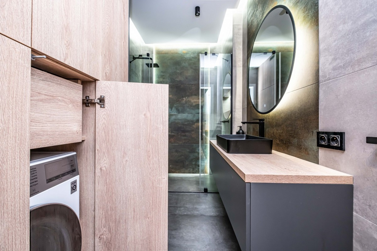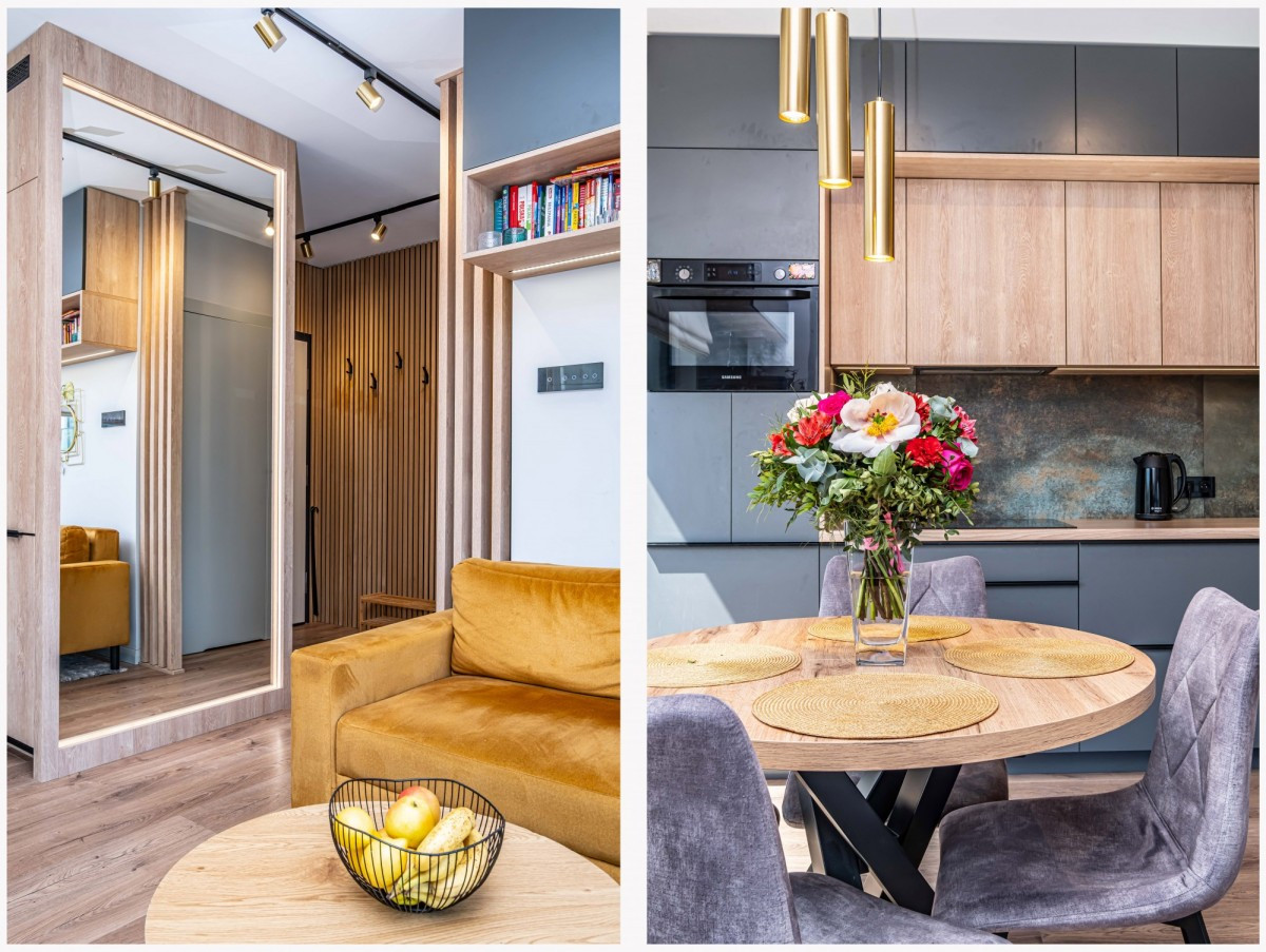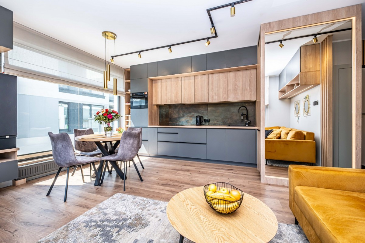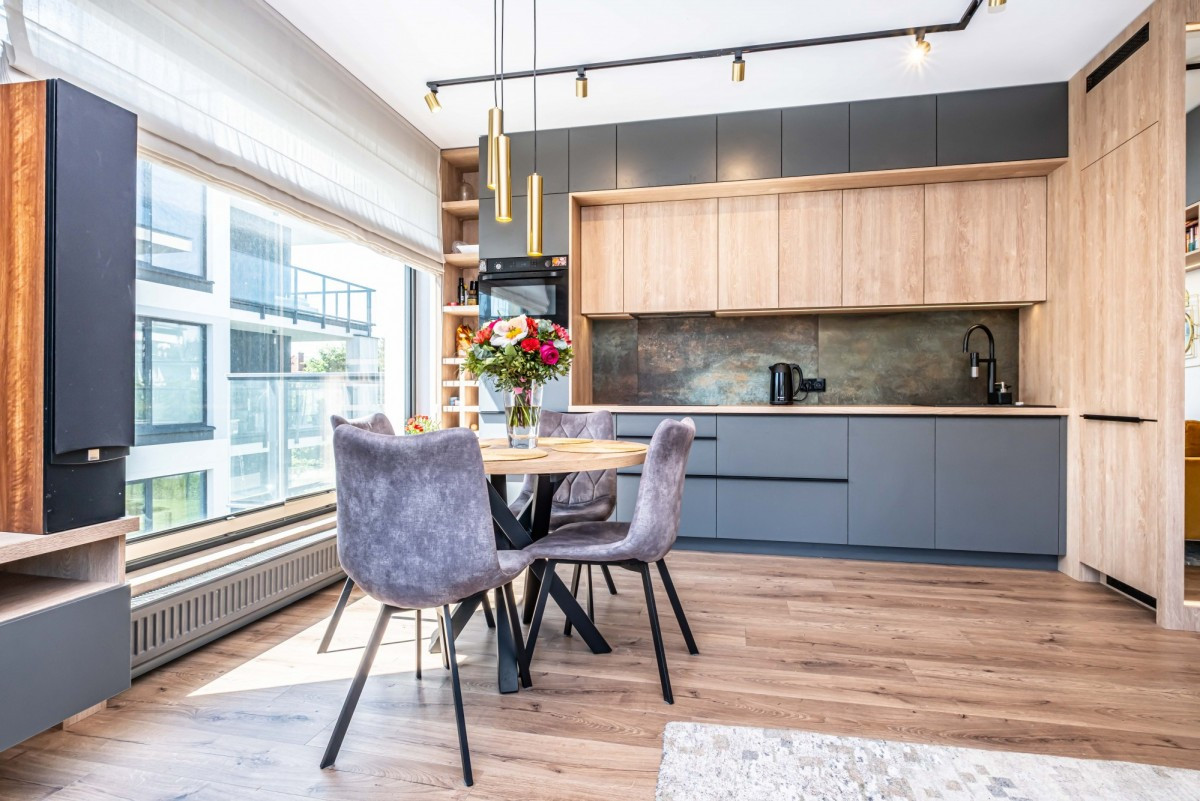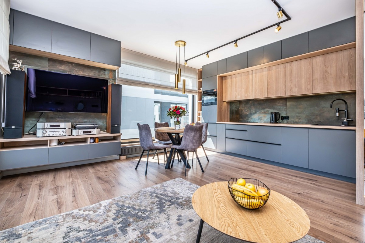 Zabudowa kuchni i pozostałych pomieszczeń została wykonana na wymiar przez firmę stolarską co zapewniło maksymalne wykorzystanie przestrzeni oraz wysoką funkcjonalność dla użytkowników.