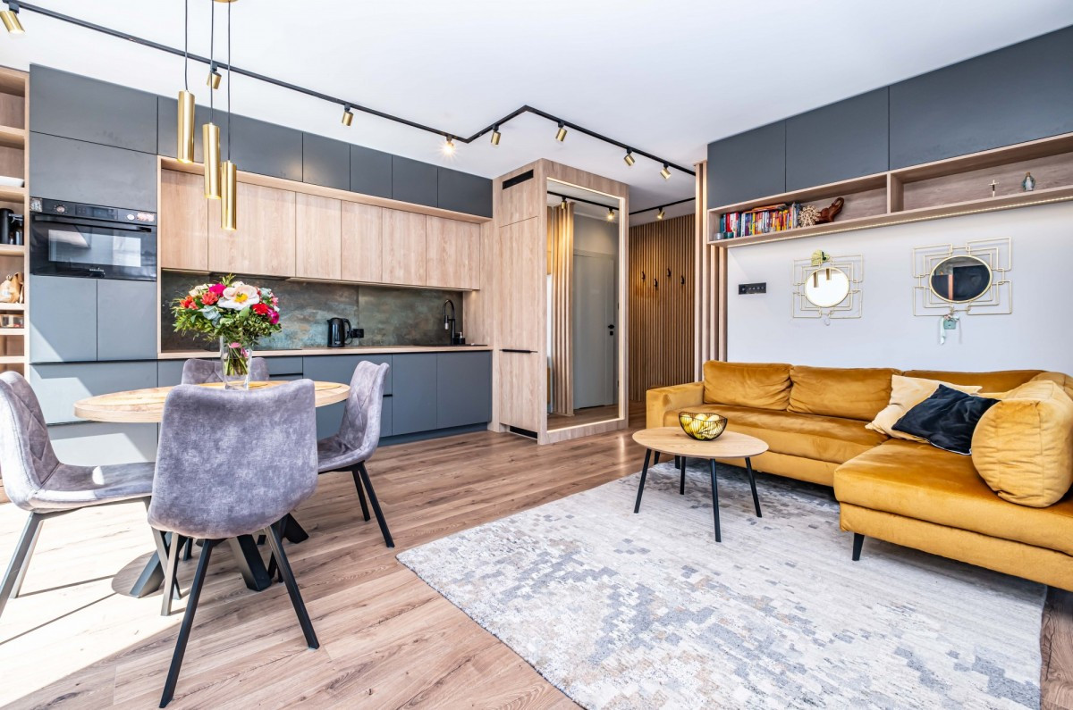 • salon z aneksem kuchennym (lodówka, zmywarka, płyta indukcyjna, piekarnik z mikrofalą) - 22,34 m2