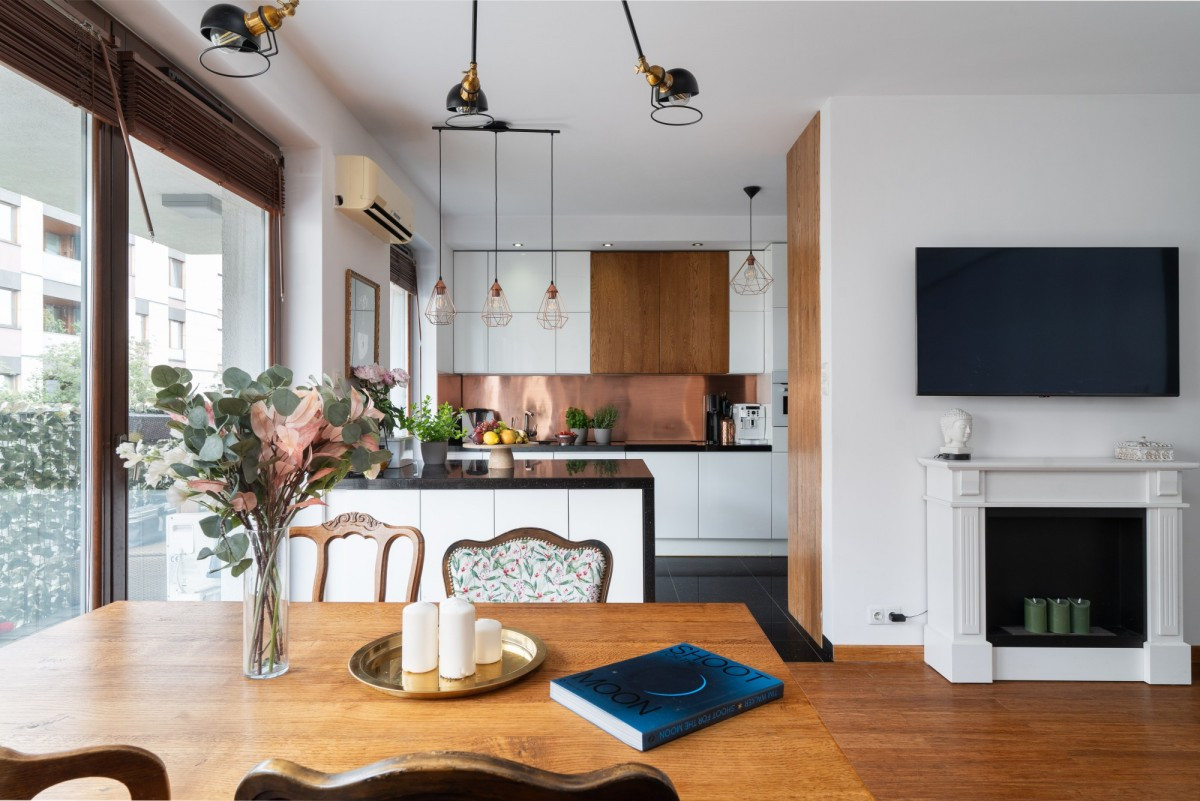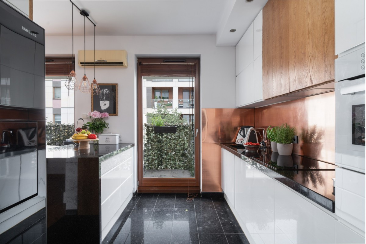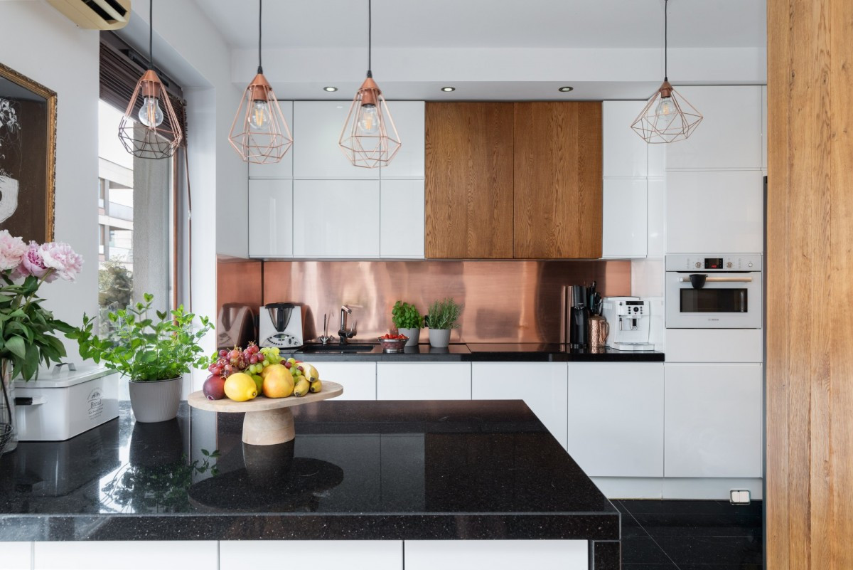 • Blaty kuchenne z granitu, a na ścianie w kuchni naturalna miedź - oryginalne i trwałe wykończenie