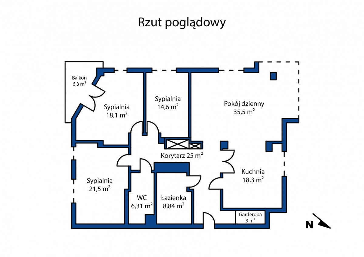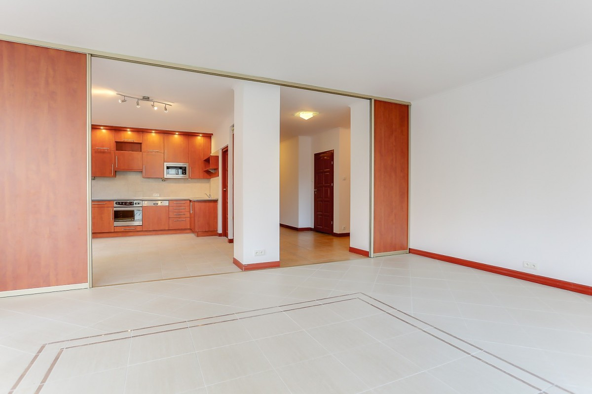 Kuchnia z przejściem do salonu przez przesuwane drzwi, 3 pokoje, 2 łazienki, garderoba, przestronny hall, wbudowana szafa w korytarzu, loggia. Dokładne rozplanowanie jest pokazane na załączonym do oferty rzucie.