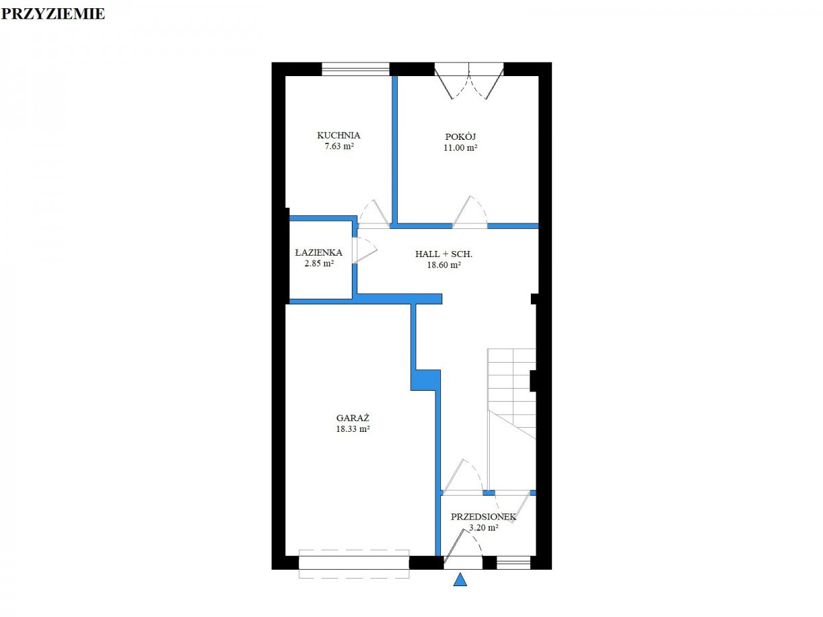 W przyziemiu znajduje się garaż w podcieniu, przedsionek, hall, łazienka z kotłownią, kuchnia oraz przytulny pokój z wyjściem na taras i ogród.