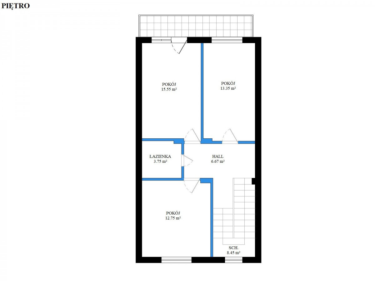 Na piętrze znajdują się komfortowa sypialnia, elegancki gabinet i łazienka z wc, a użytkowe poddasze oferuje dwa pokoje, praktyczne schowki oraz łazienkę z wanną i WC.