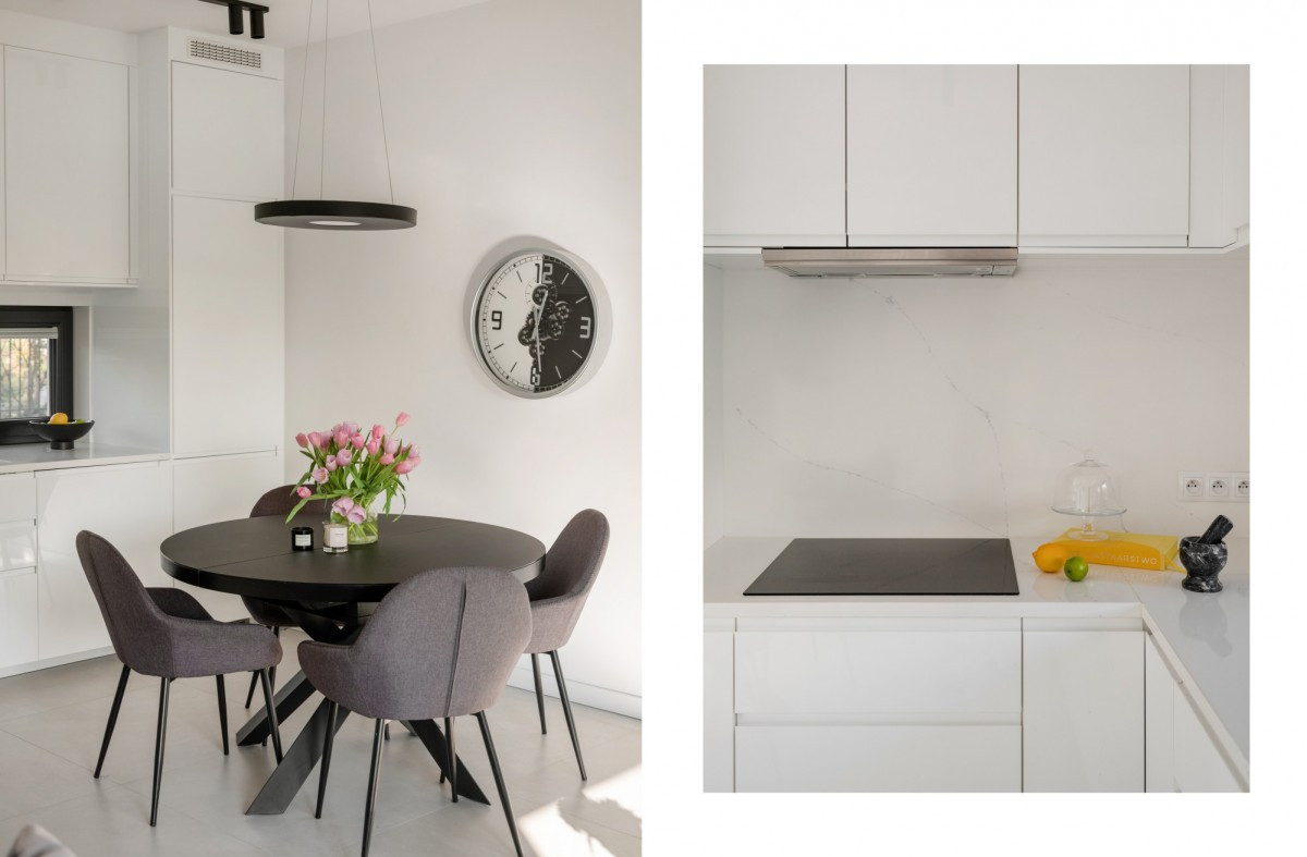 • Nowoczesna kuchnia z oknem i jadalnią