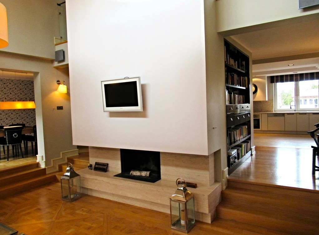 - salon ok. 36,00 m2 (wysokość ponad 5 m), kominek w trawertynie