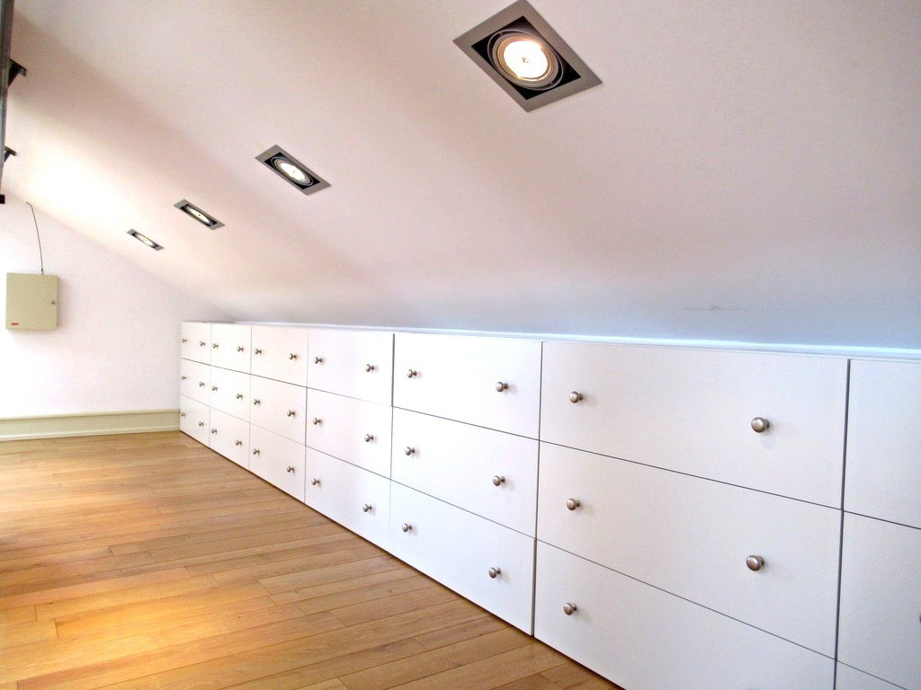 Pod skosami dachu są miejsca przeznaczone na garderoby, kącik zabaw, pokój rekreacyjny.