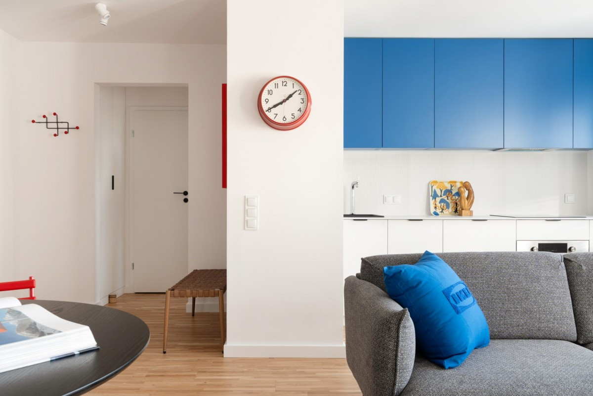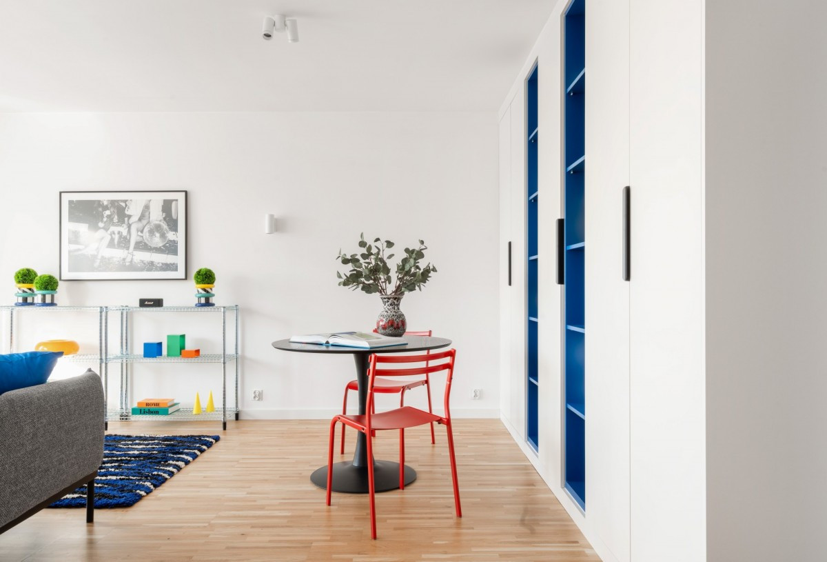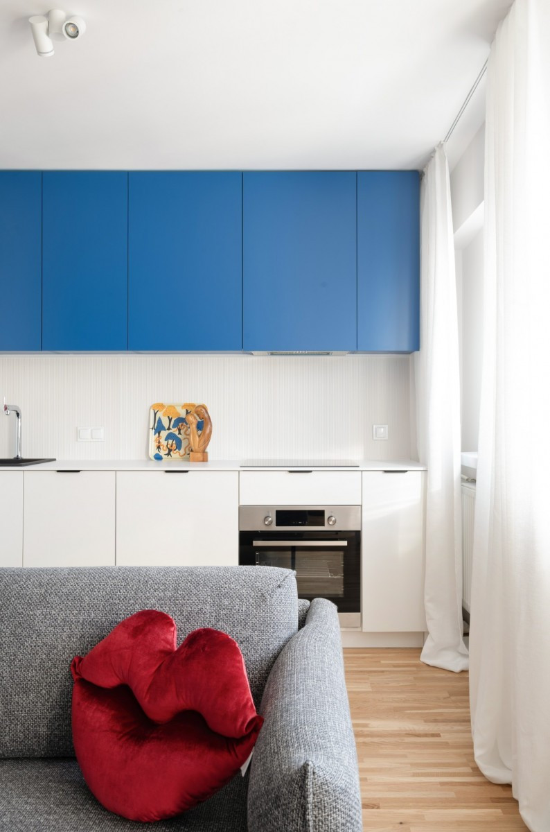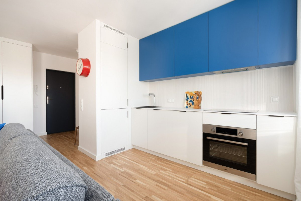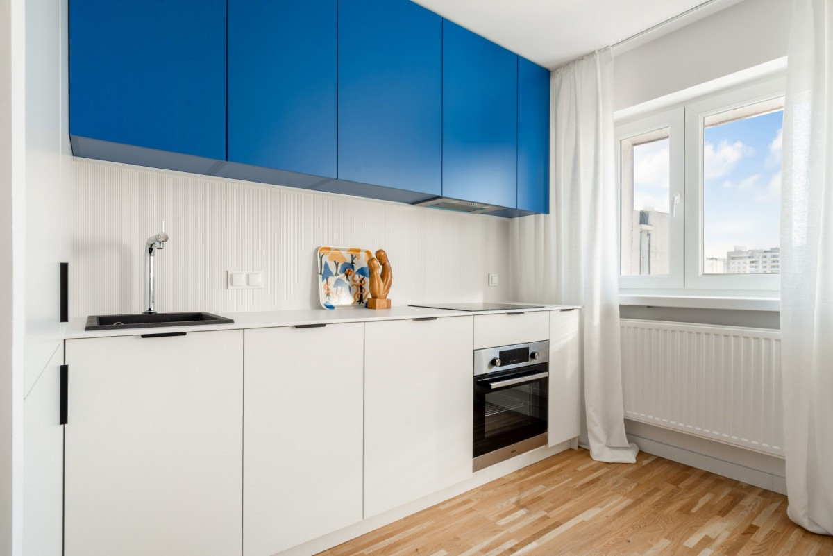 Zabudowana kuchnia wyróżnia się kontrastowym akcentem - biały dół zestawiony z intensywnym, niebieskim kolorem wiszących szafek tworzy wyrazisty detal. W ciągu roboczym pełne wyposażenie AGD: zmywarka, piekarnik, płyta indukcyjna, okap.
