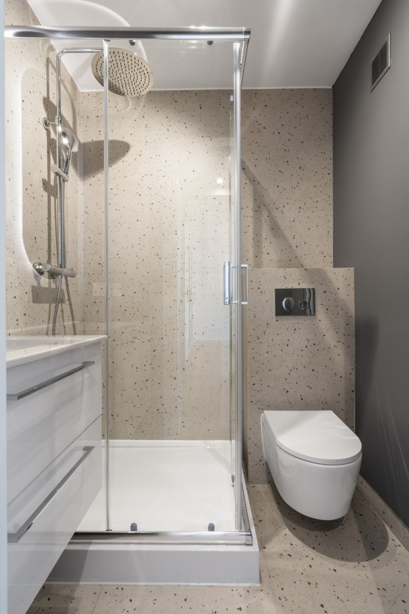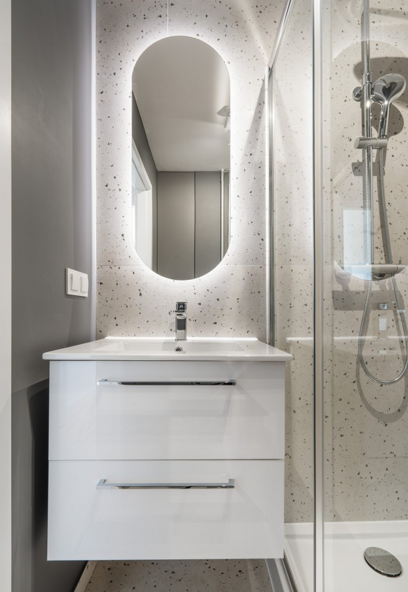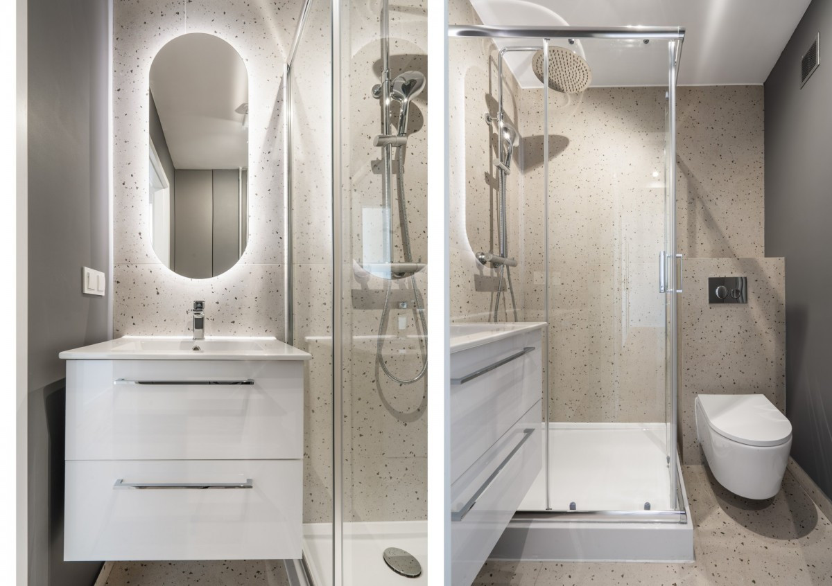 Łazienka urządzona została w ciepłej kolorystyce ziemi - ściana oraz zabudowana szafa w ciemnym odcieniu szarości świetnie komponują się z piaskowymi kafelkami. Biel i metaliczne detale armatury w połączeniu z umieszczonym za lustrem oświetleniem LED, nadają pomieszczeniu wyjątkowy, elegancki charakter. W łazience znalazło się miejsce dla dużej kabiny prysznicowej o wymiarach 80x100 cm.