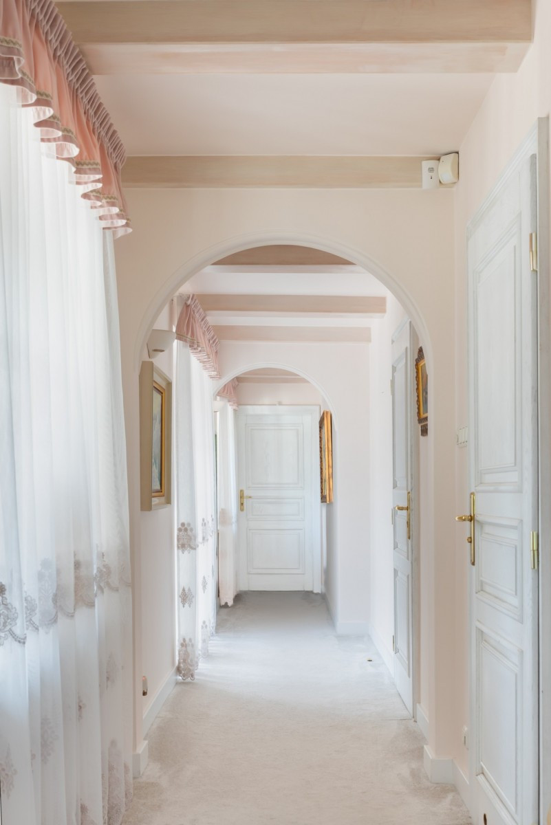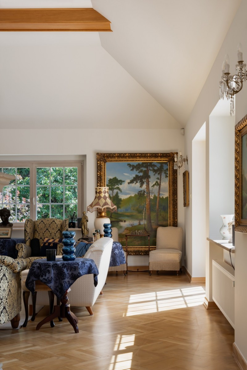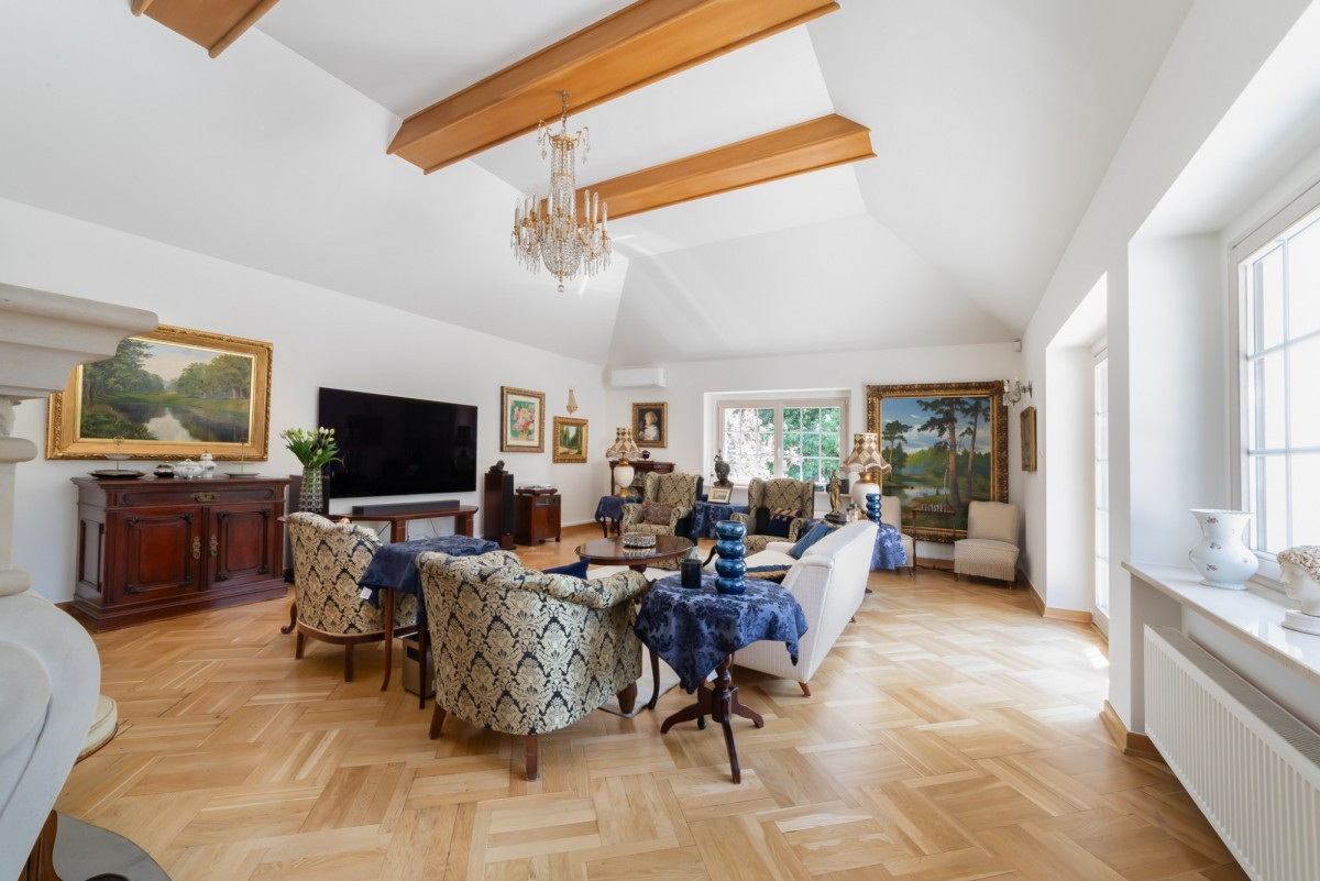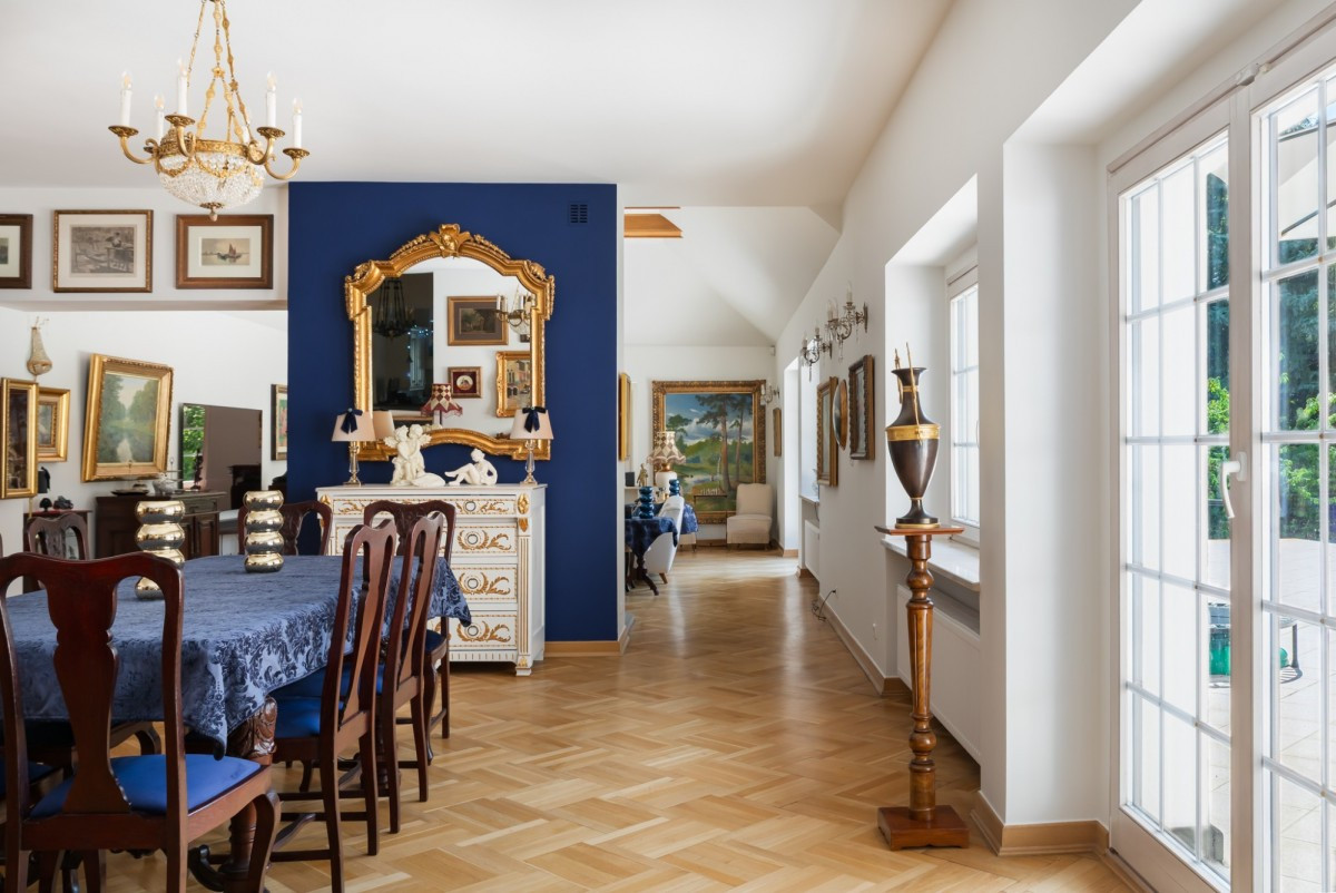 Na parterze znajduje się reprezentacyjna strefa dzienna z przestronnym salonem, dwiema jadalniami oraz dużą, oddzielną kuchnią z przyległą spiżarnią. W tej części domu znajdują się także trzy pokoje, dwie łazienki, szatnia, dwa przedsionki oraz komunikacja. Ogromny taras i wygodny dostęp do ogrodu tworzą poczucie otwartości.