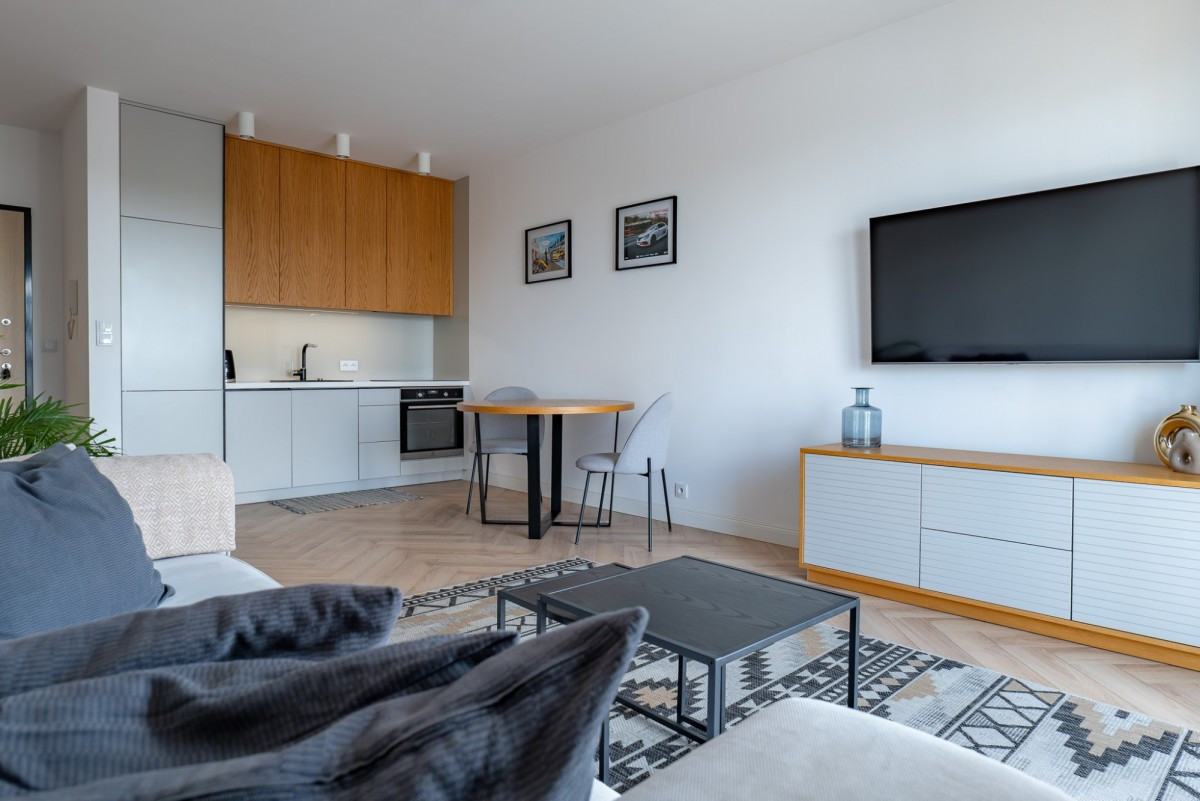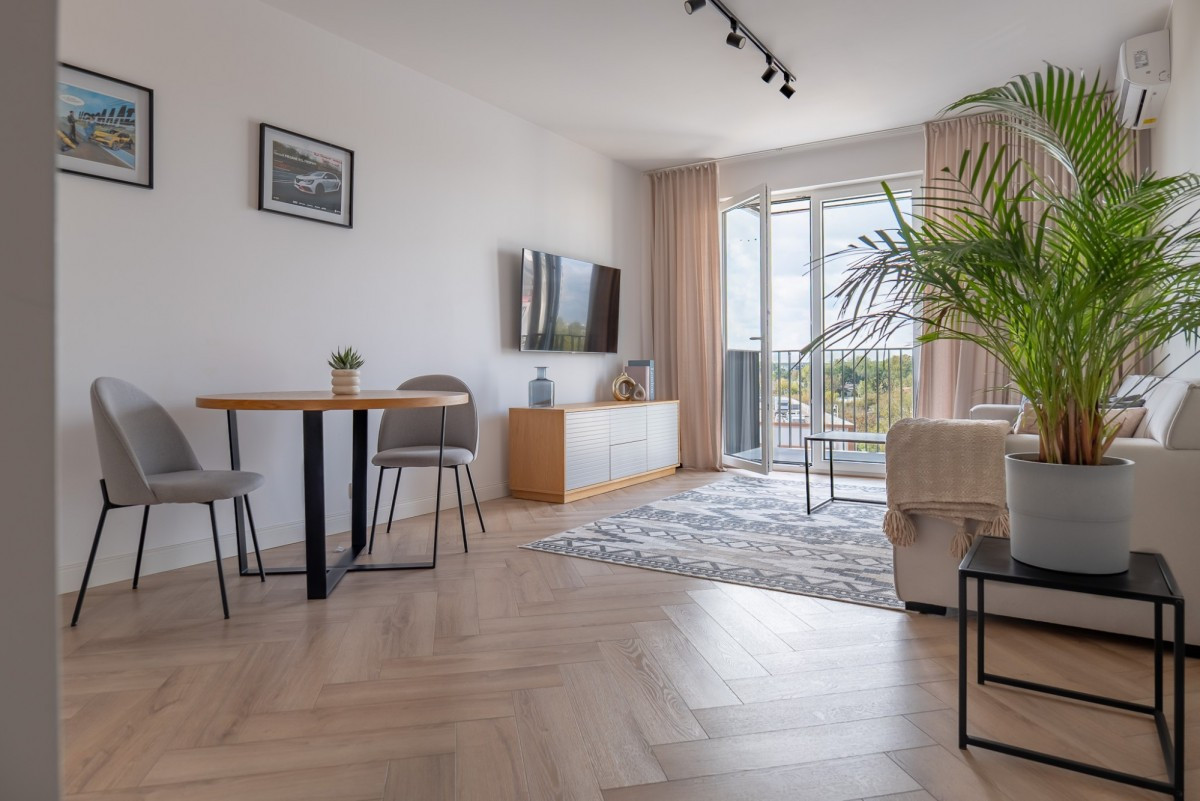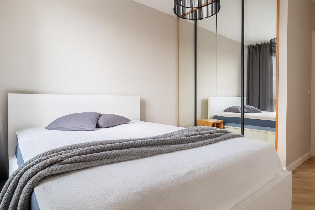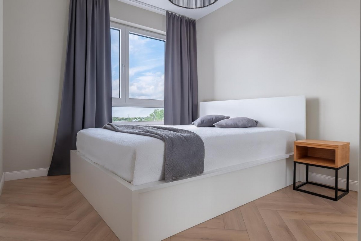 Mieszkanie zostało wykończone w stylu minimalistycznym, z dbałością o detale - na podłodze elegancka jodełka, a dla pełnego komfortu zainstalowano klimatyzację. Atutem jest niezabudowany widok z okien i balkonu, który daje poczucie przestrzeni.