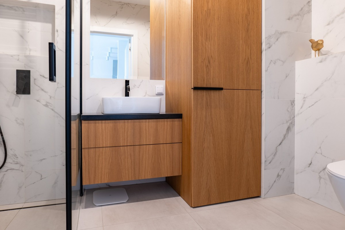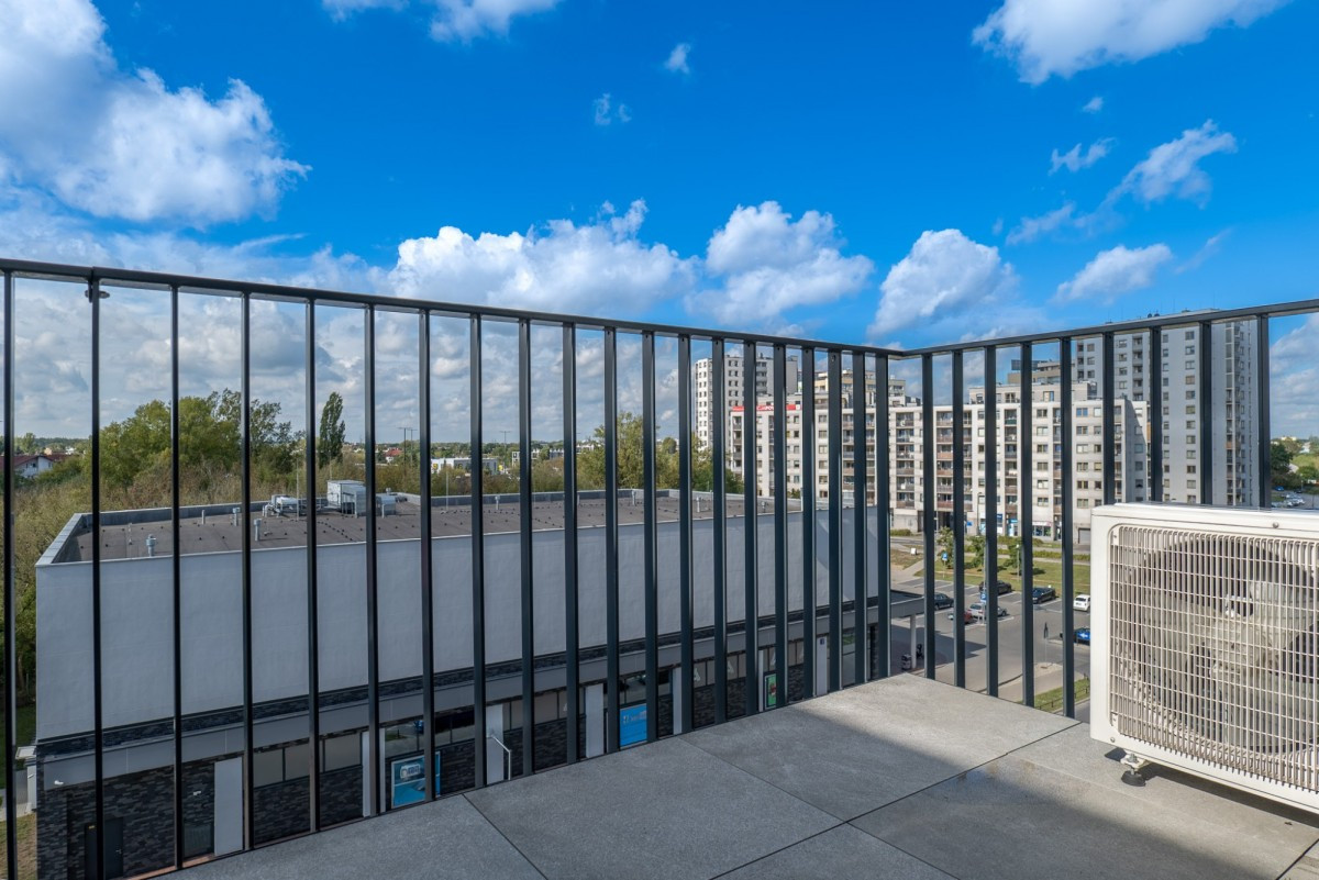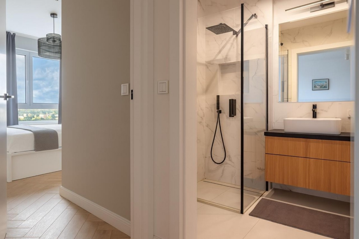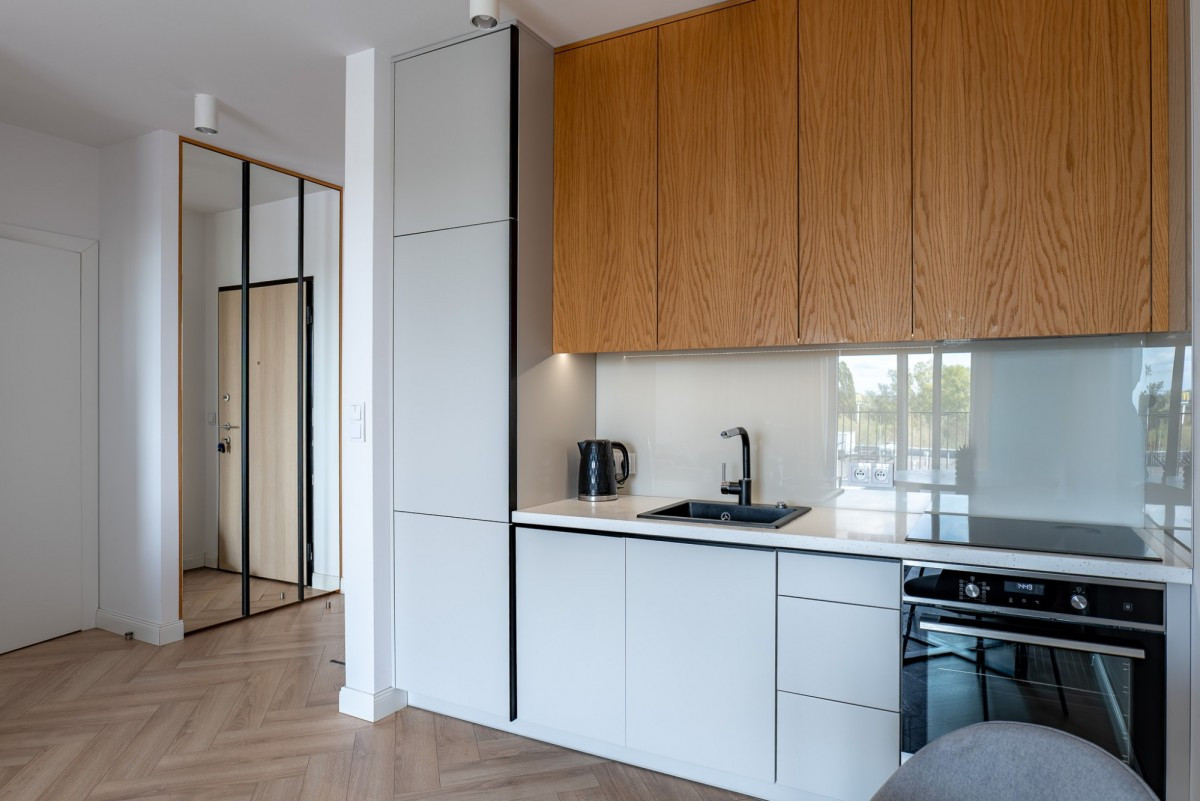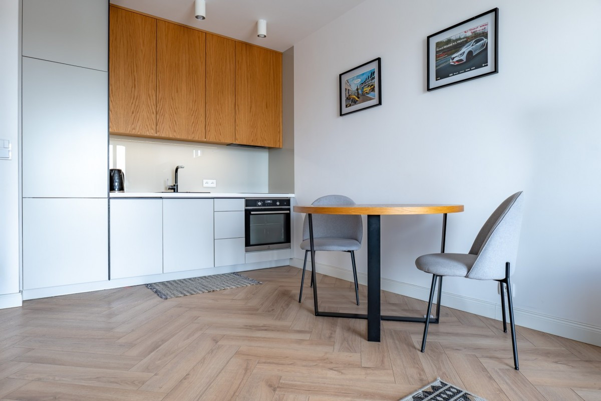 Mieszkanie zostało wykończone w stylu minimalistycznym, z dbałością o detale - na podłodze elegancka jodełka, a dla pełnego komfortu zainstalowano klimatyzację. Atutem jest niezabudowany widok z okien i balkonu, który daje poczucie przestrzeni.