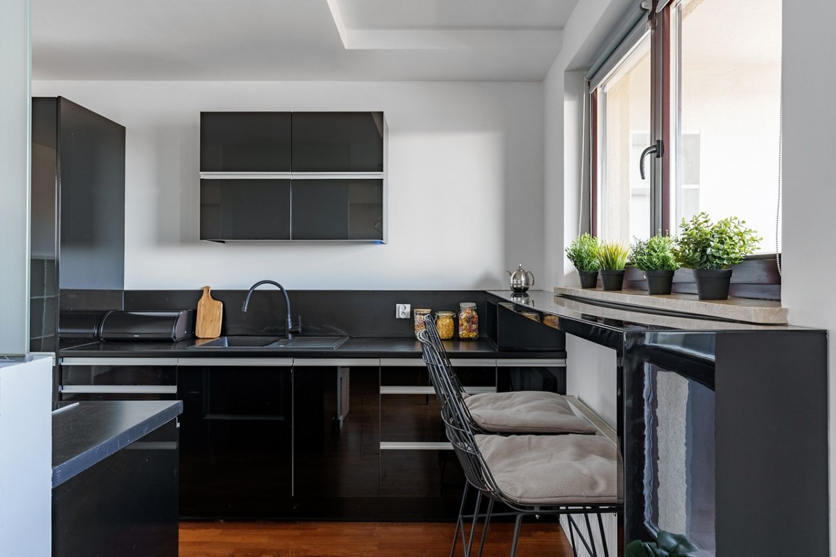 Wysoki standard wykończenia - meble na zamówienie, naturalna deska jesionowa, fornir hebanowy, sprzęty Siemens, armatura Hansgrohe.