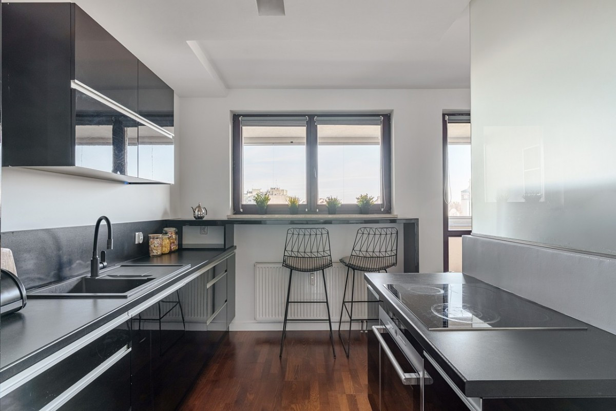 Salon z aneksem kuchennym od strony wschodniej - poranna kawa z widokiem na centrum Warszawy.