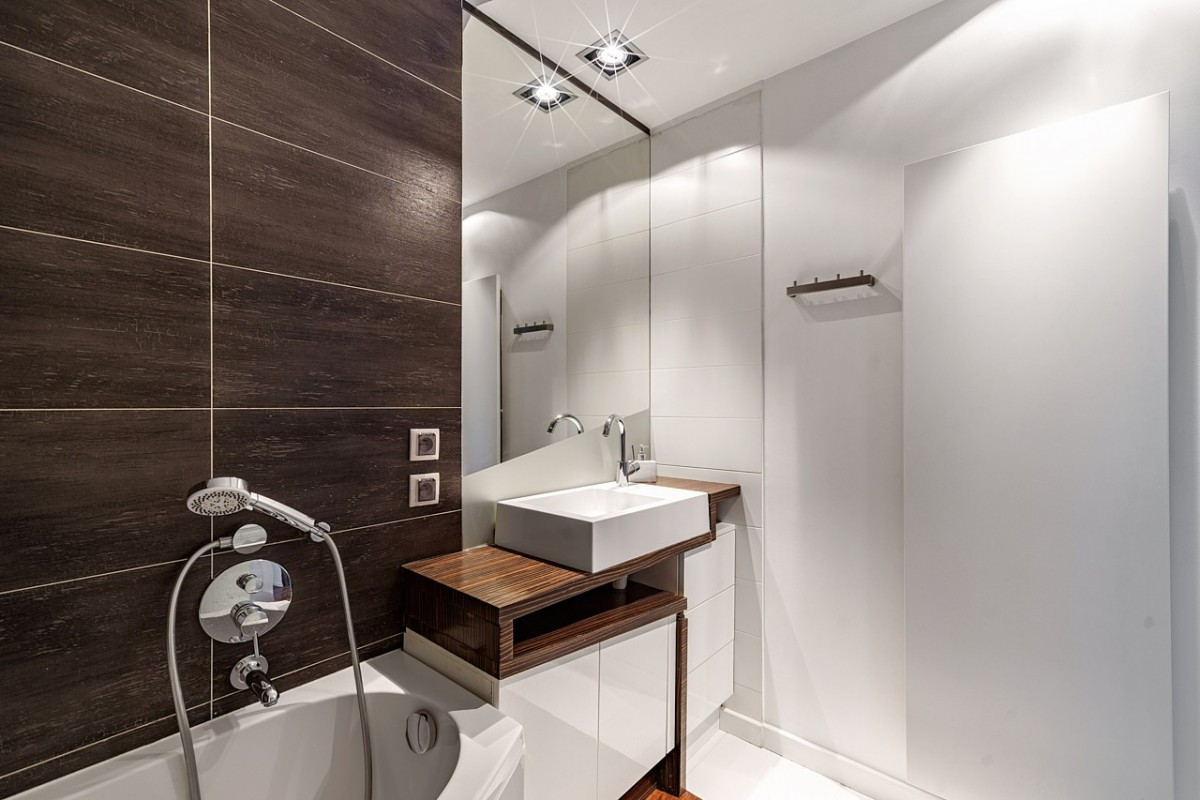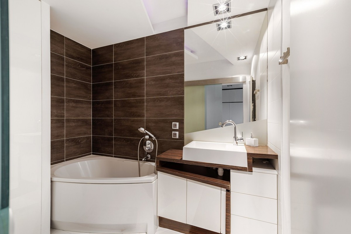 Łazienka z wanną i szafą ukrywającą pralkę Electrolux (7 kg, inwerter).