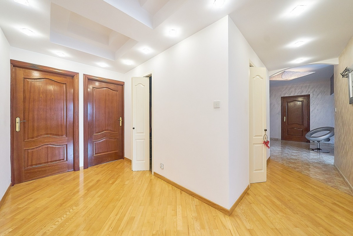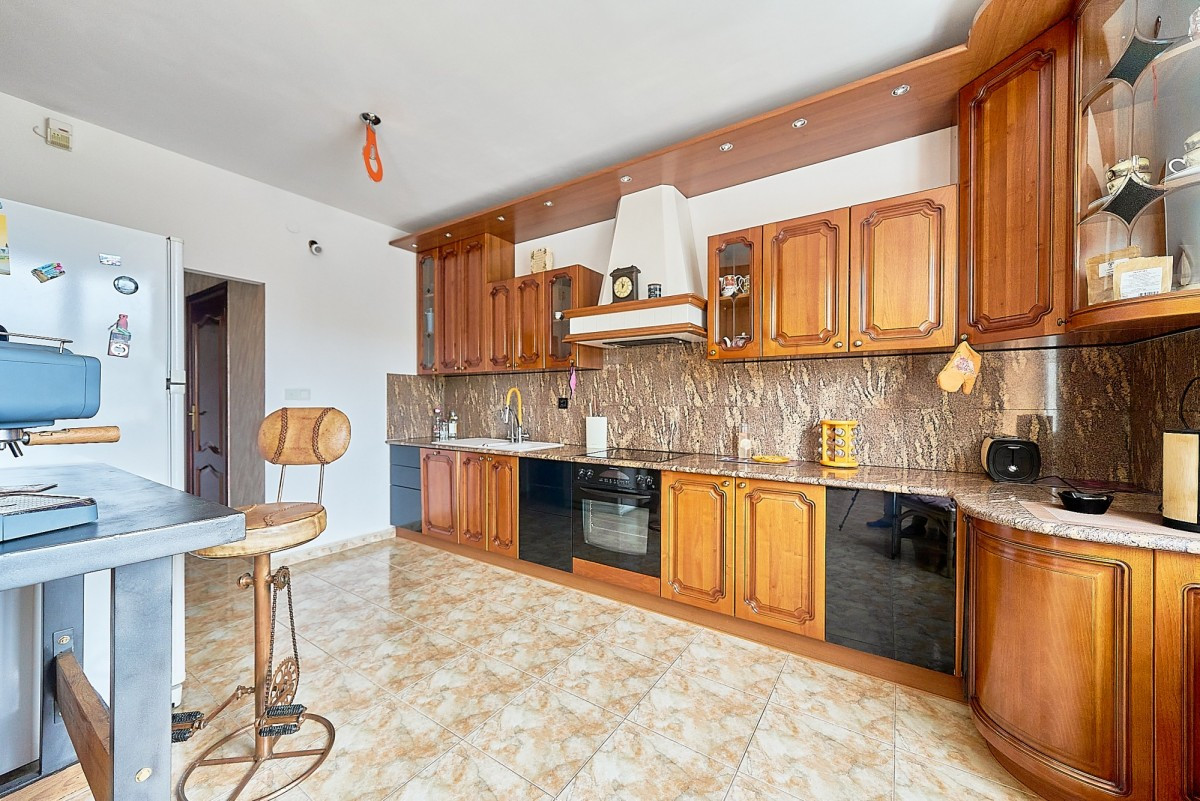 Na podłogach znajdują się parkiet oraz płytki ceramiczne, a kuchnia wyposażona jest w drewnianą zabudowę.