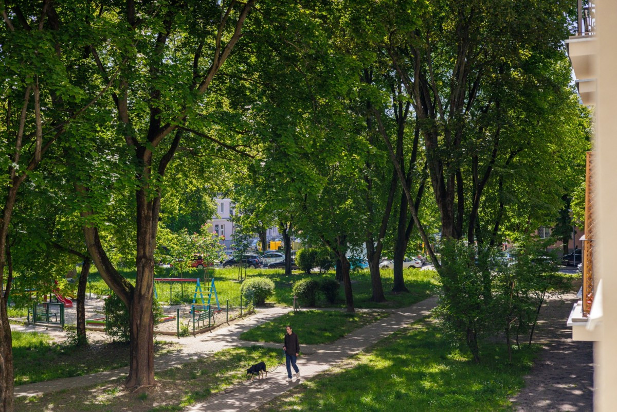 Mieszkanie jest niezwykle ciche, wejście do klatki jest od ulicy Lipskiego a wszystkie okna wychodzą na zielony skwer z pięknymi starymi drzewami. Nie ma tu mowy o nielubianym "okno w okno" - mamy tu światło i przestrzeń. Lokal jest wysoki (272cm od parkietu). Na podłodze znajdziemy odrestaurowany stary dębowy parkiet, który będzie służył przez długie lata. Wszystkie okna są nowe o bardzo dobrych parametrach energetycznych (trzyszybowe, dwukomorowe).