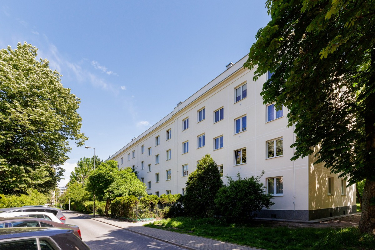 Wiktorska 86. Elegancki i zadbany 4-ro piętrowy budynek z początku lat 50-tych, który właśnie przeszedł remont elewacji.