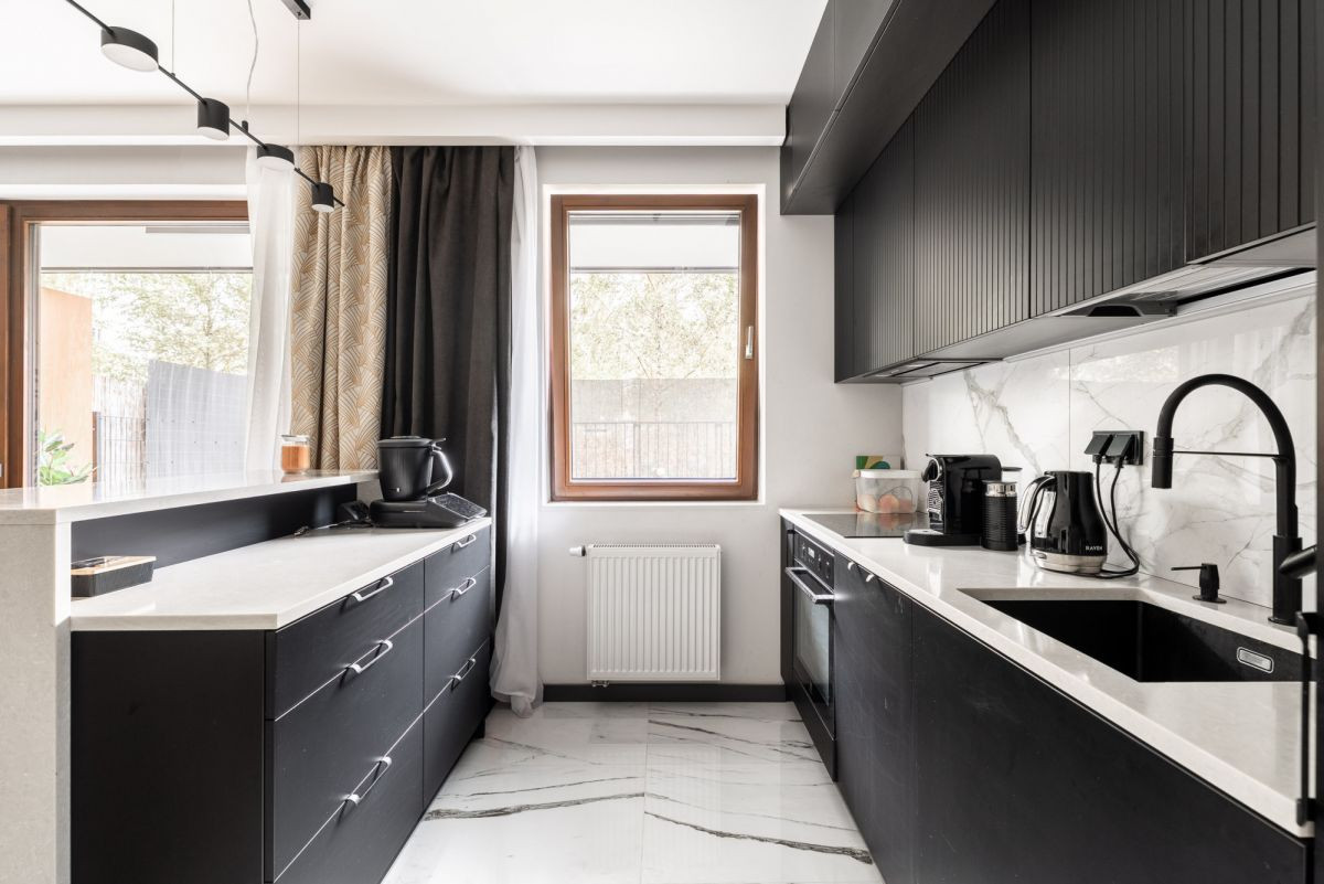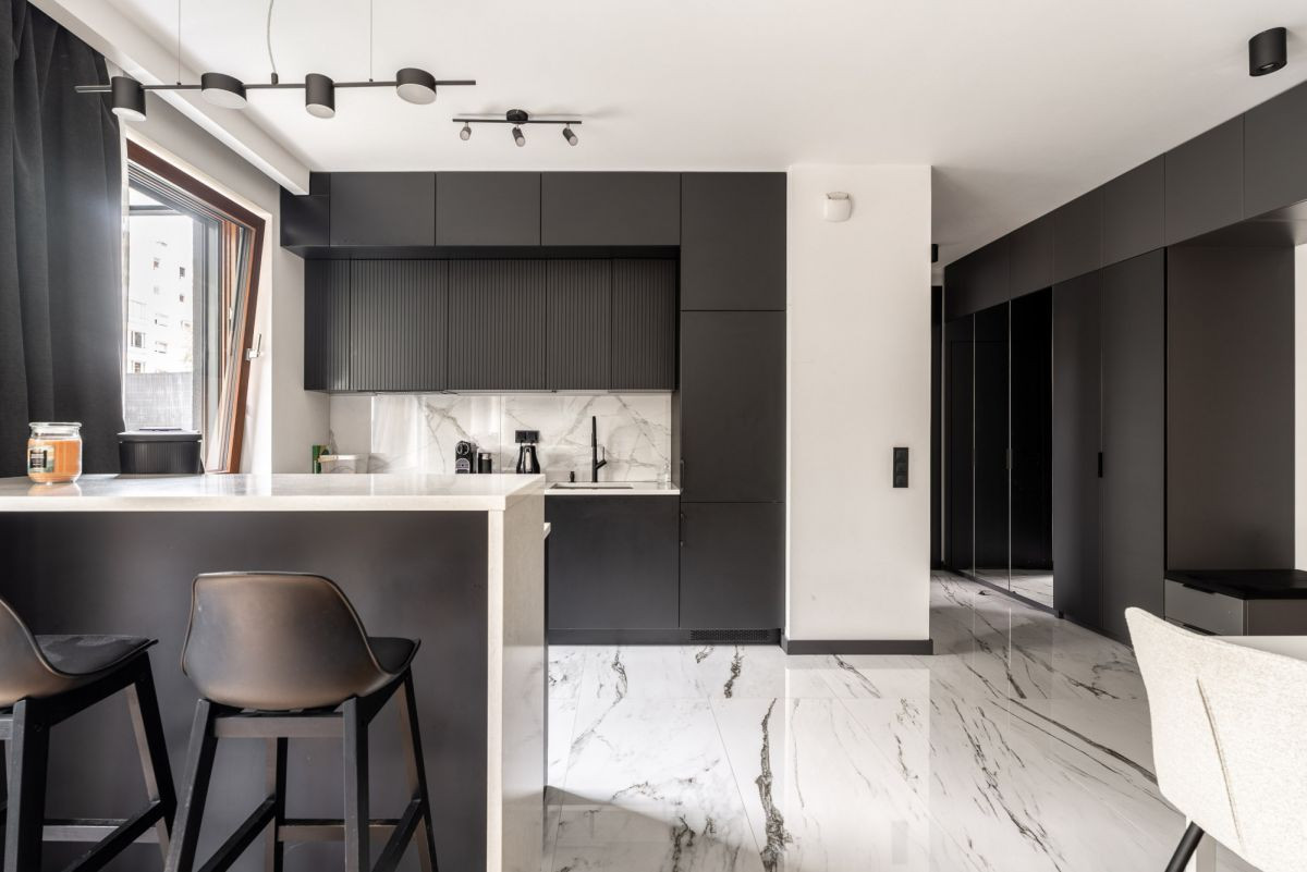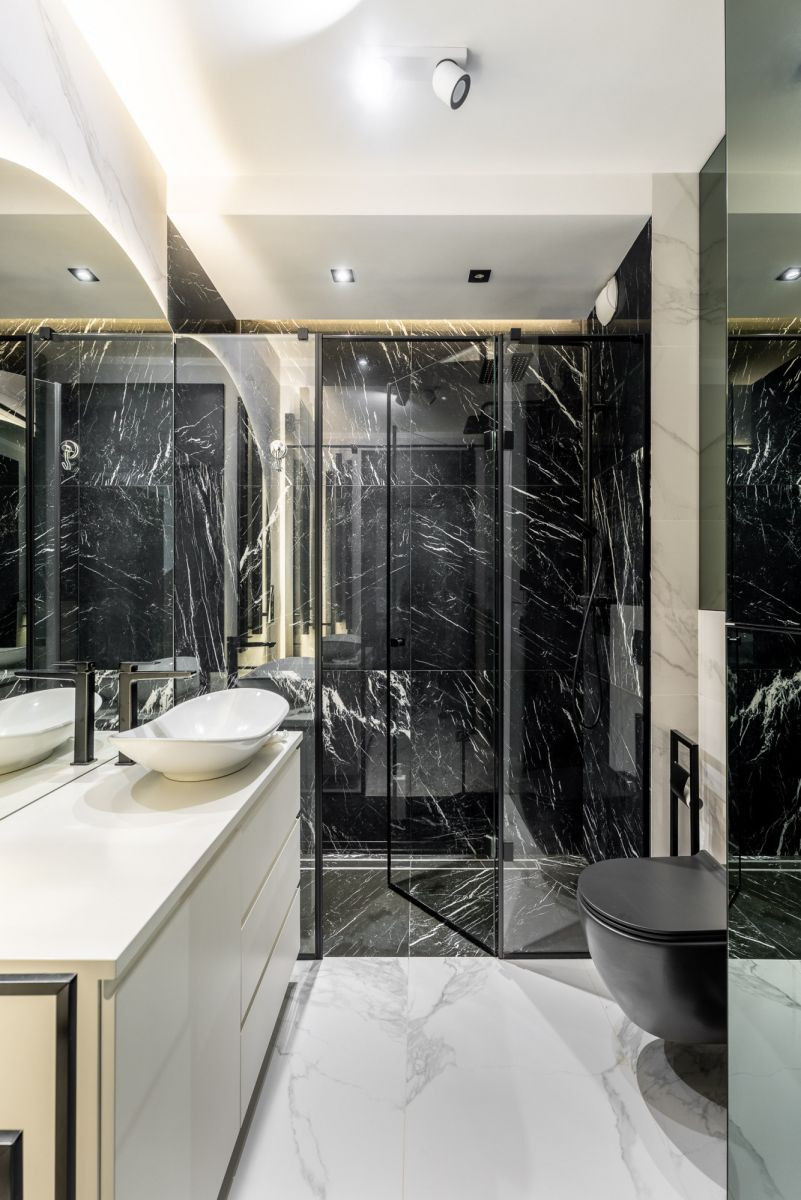 Uwagę przyciągają wysokiej jakości materiały - drewno oraz wykończenia w stylu marmuru, które nadają przestrzeni szlachetności. Przemyślana, oszczędna w dekoracje aranżacja sprawia, że mieszkanie jest niezwykle przestronne i uporządkowane.
