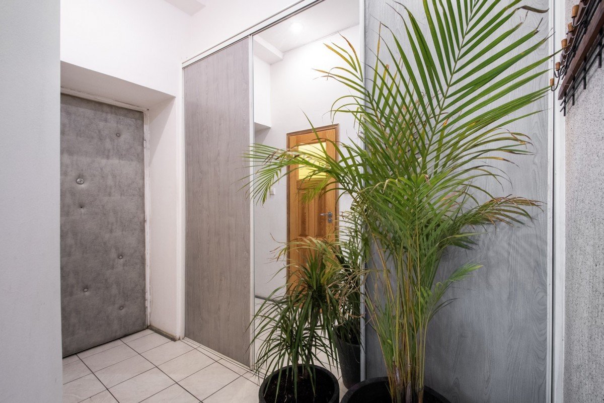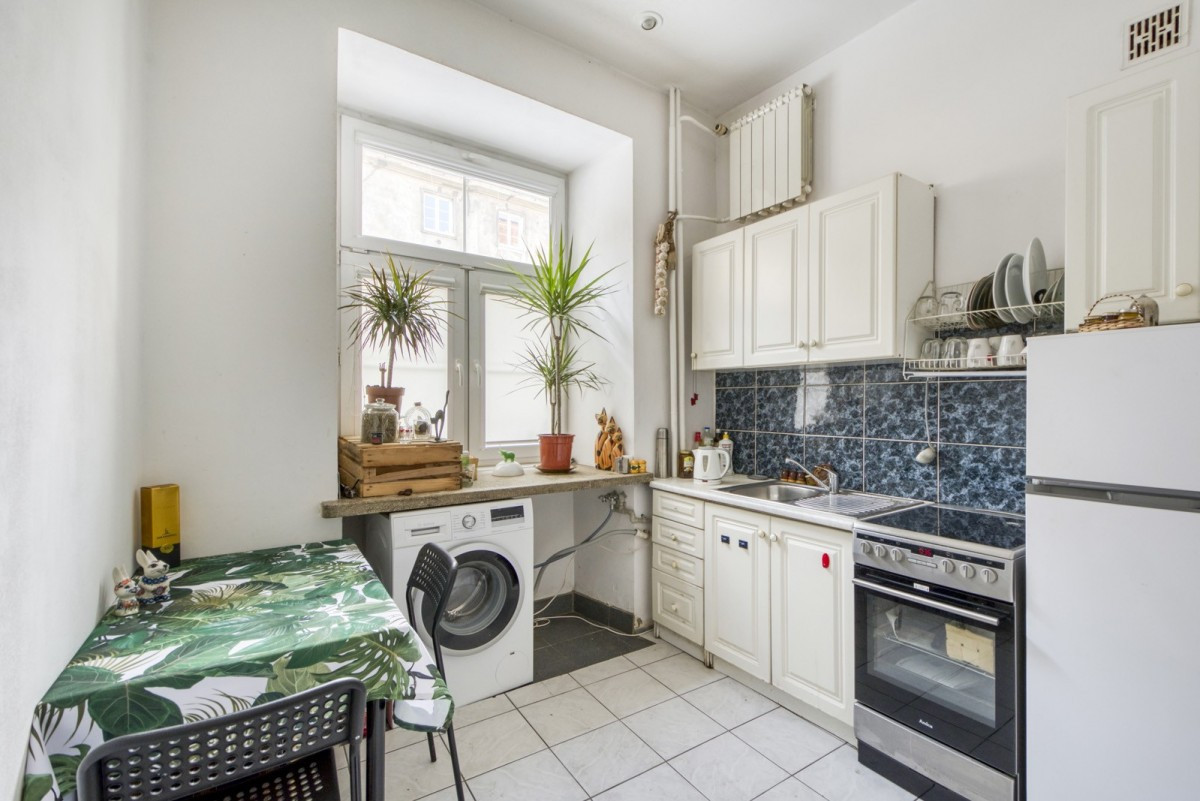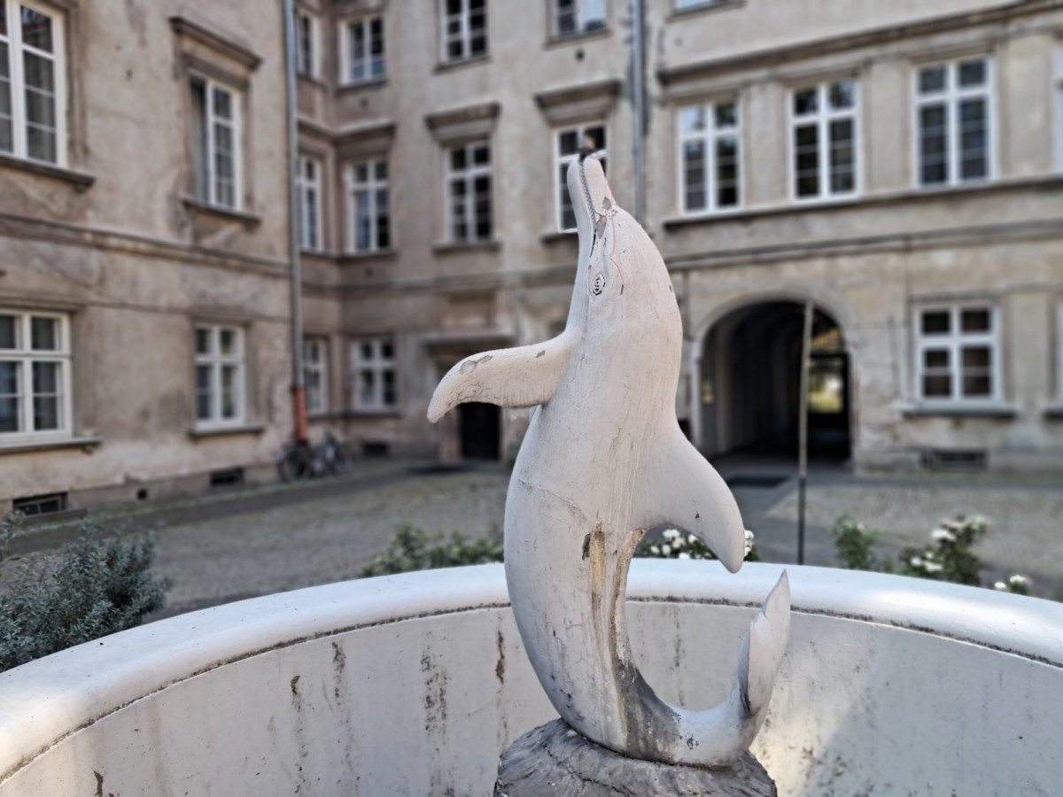 Mimo usytuowania na parterze, mieszkanie jest niezwykle widne i ciche, dzięki oknom wychodzącym na urokliwy dziedziniec z fontanną z delfinem. To idealne miejsce dla osób ceniących kameralność i historię.