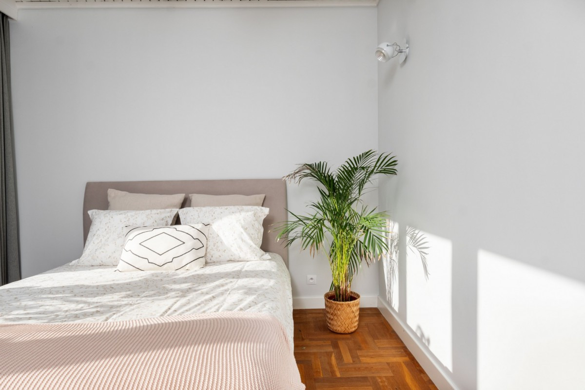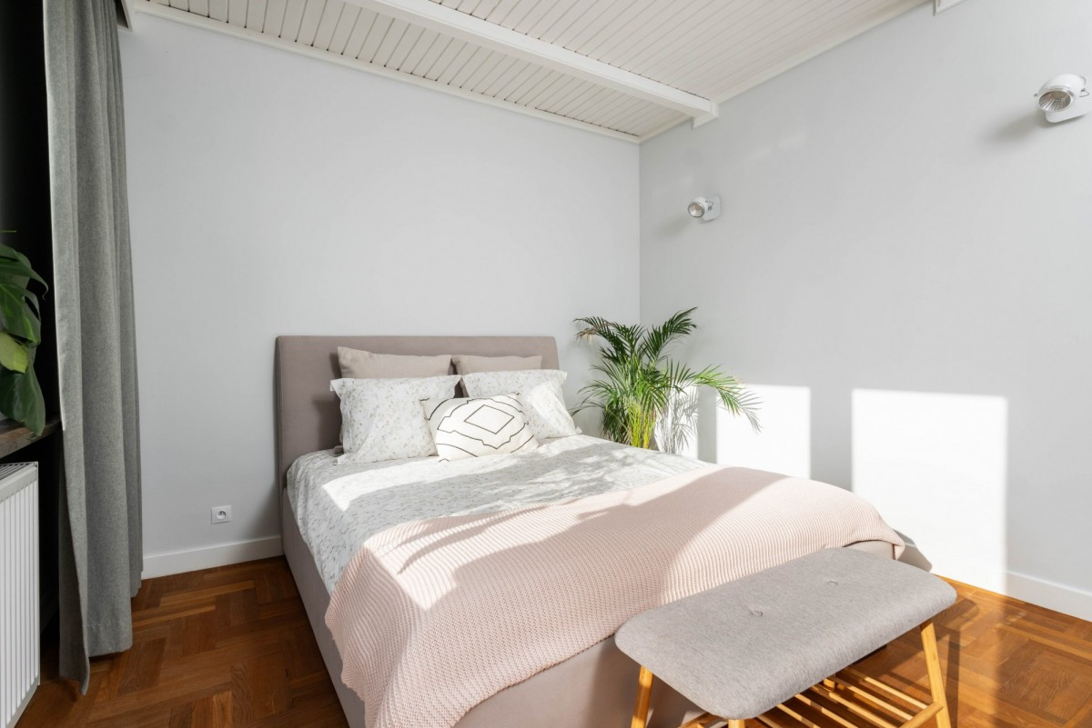 Sypialnia główna (14 m²) z balkonem i widokiem na ogród.