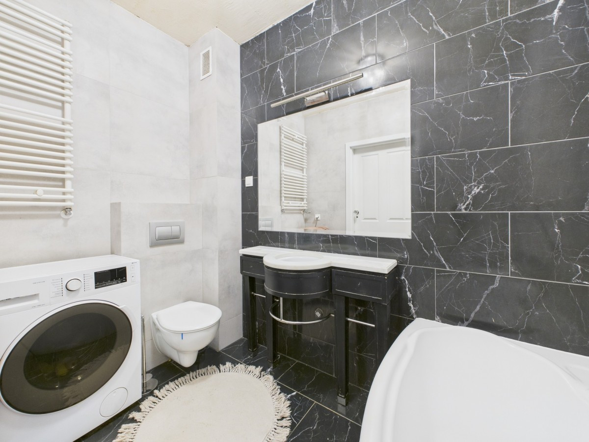 Do dyspozycji jest również duża sypialnia o powierzchni ponad 10 m² z dużym oknem, które doskonale doświetla wnętrze. Łazienka została wykończona w eleganckiej, nowoczesnej stylistyce - z wykorzystaniem czarnych i szarych płytek oraz wyposażona w wannę, która zapewnia komfort i relaks. W korytarzu przewidziano miejsce na obszerną szafę wnękową, gwarantującą dodatkową przestrzeń do przechowywania.