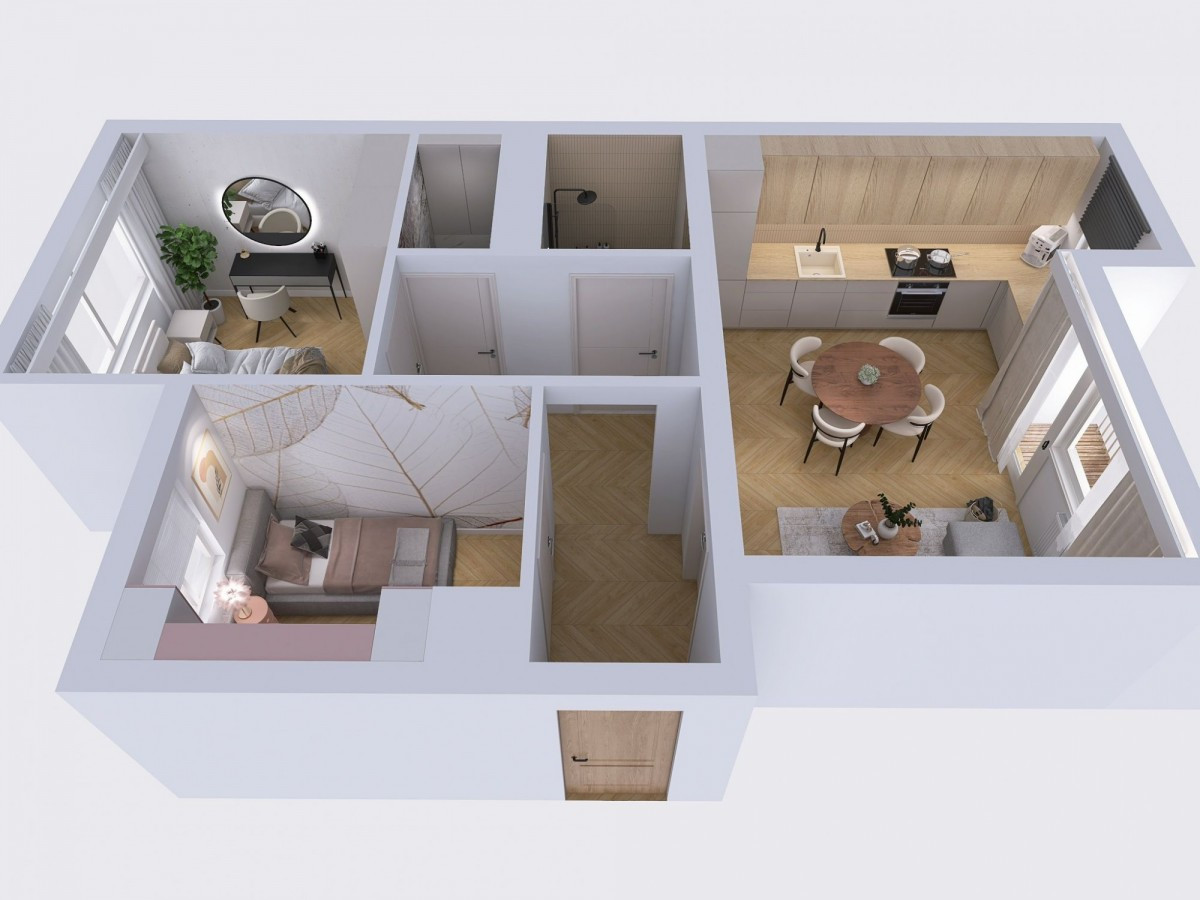 Załączona wizualizacja przedstawia możliwość wydzielenia dodatkowego pokoju i przeniesienia kuchni do salonu.