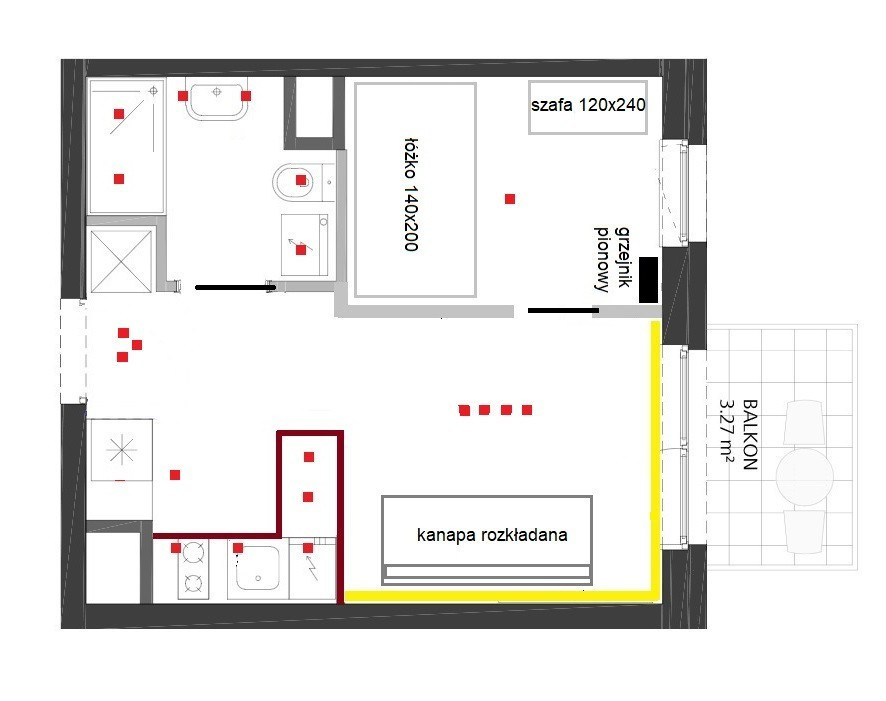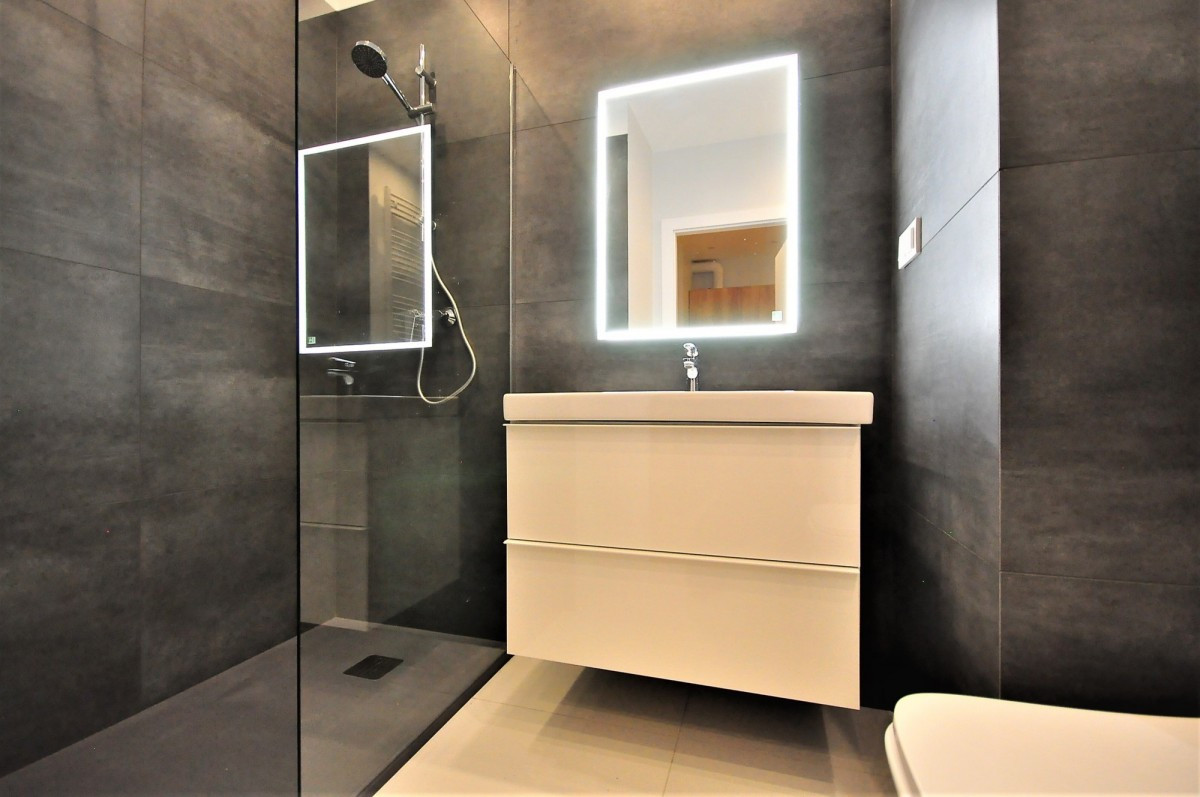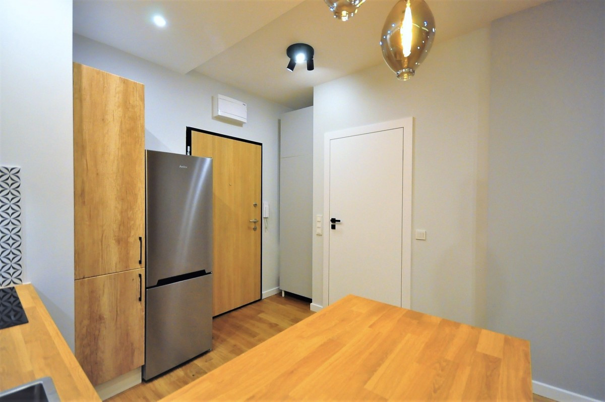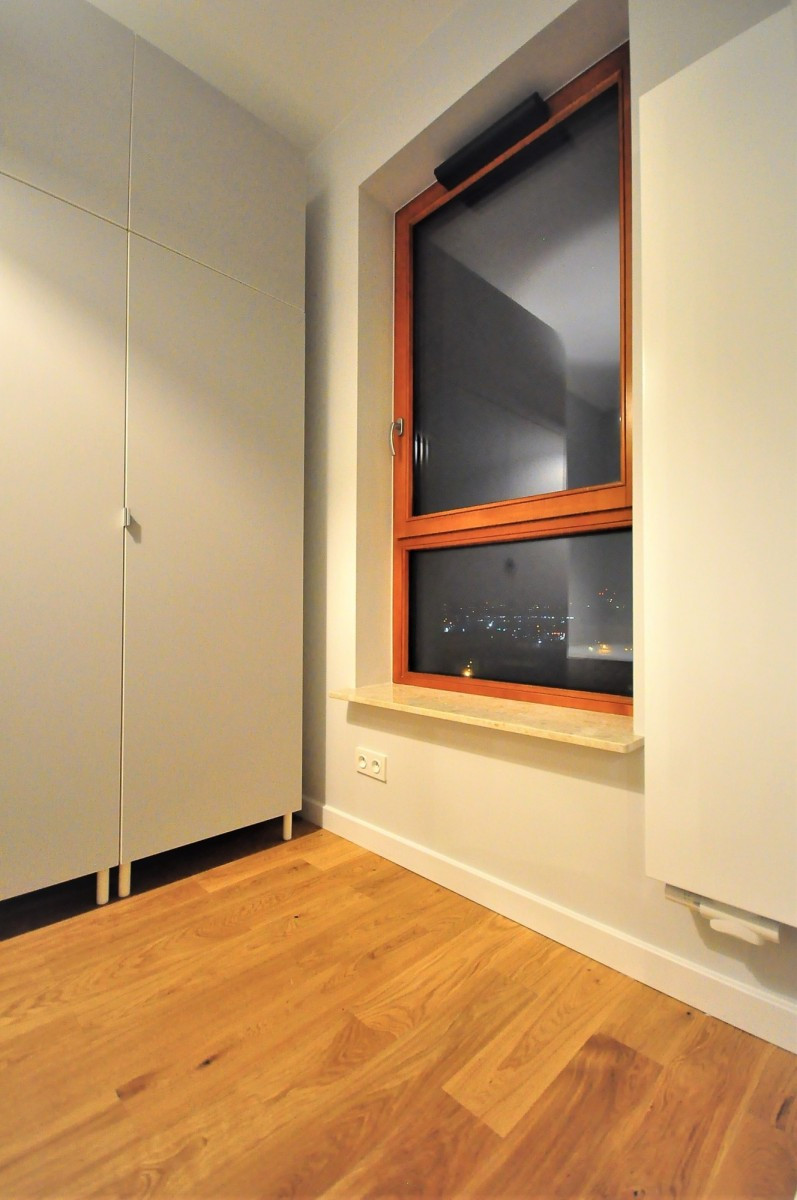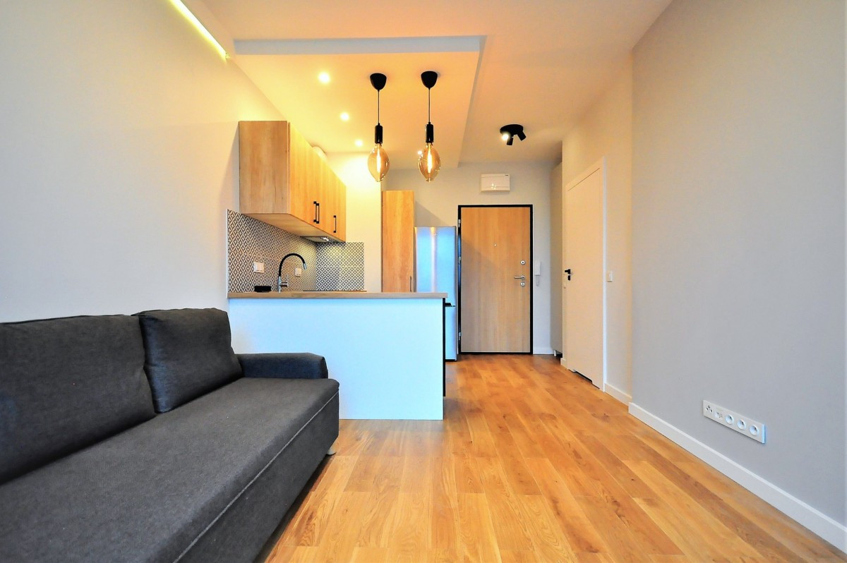 Mieszkanie jest wykończone w dobrym standardzie. Łazienka z kabiną prysznicową (brodzik Roca, szary konglomerat 140x80), na ścianach szary gres, armatura i stelaż Geberit/Hansgrohe, w całym mieszkaniu jest parkiet dębowy, okna drewniane trzyszybowe. W mieszkaniu jest wydzielona sypialnia. Meble: w sypialni łóżko 140x200, szafa. W salonie z aneksem kuchennym kanapa rozkładana, szafka/komoda RTV, meble kuchenne z AGD - duża lodówka, płyta indukcyjna, okap, piekarnik, zmywarka.
