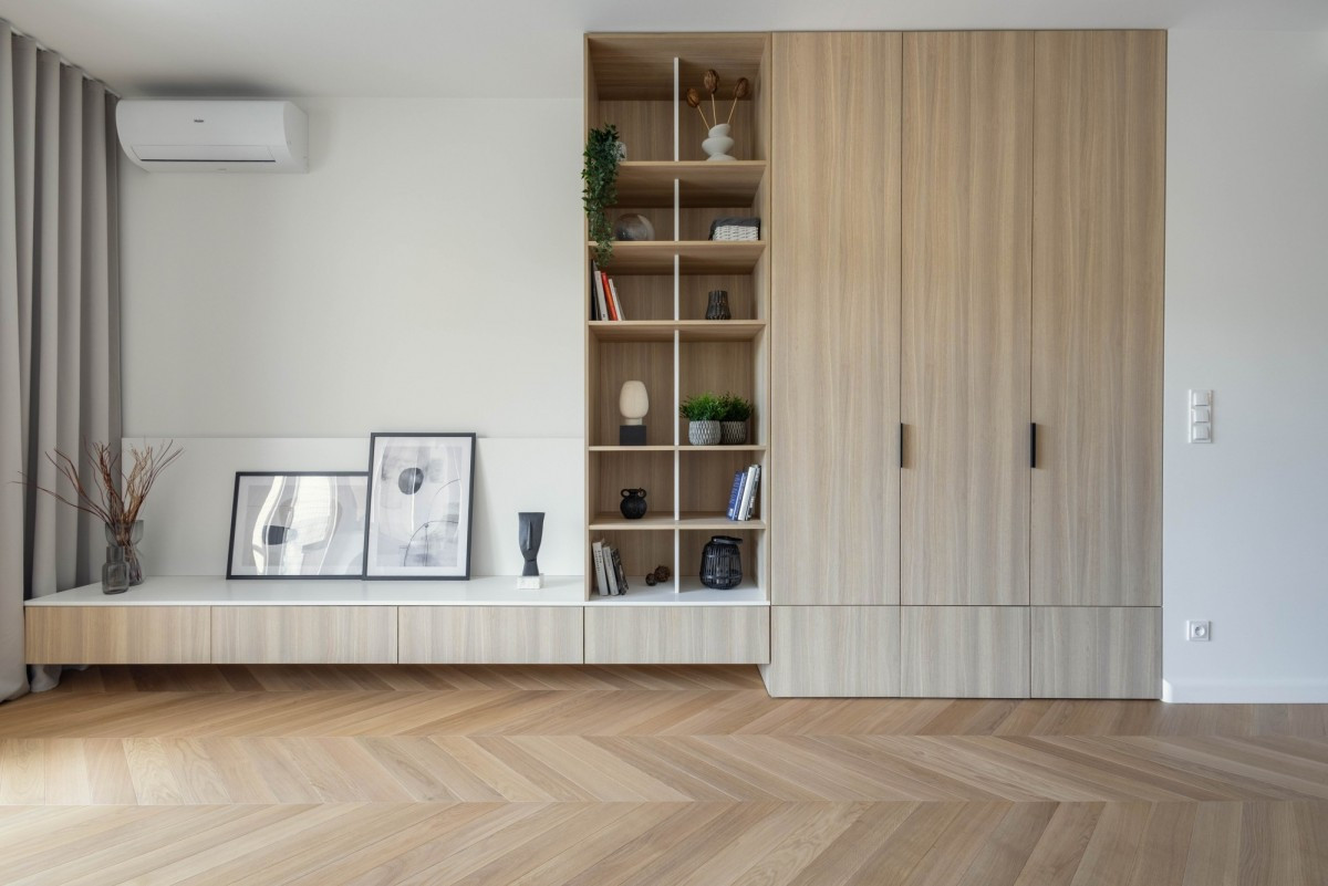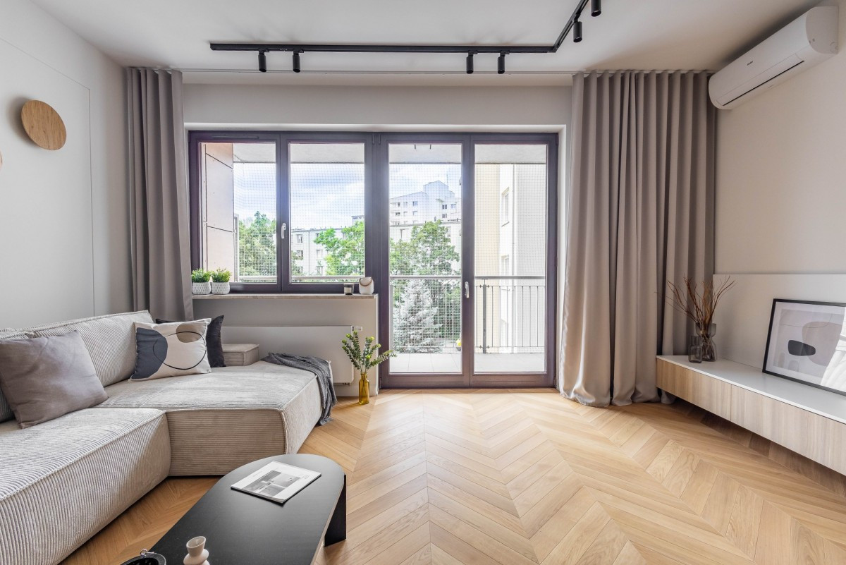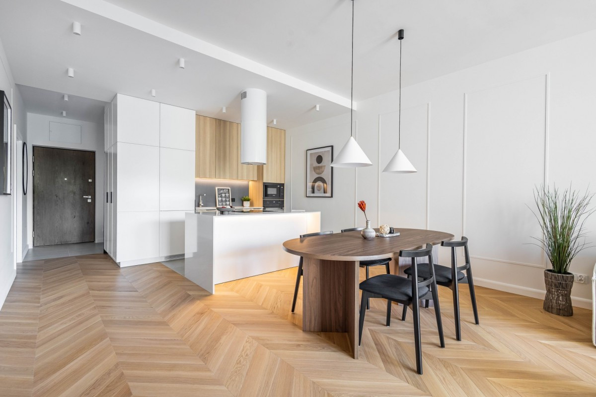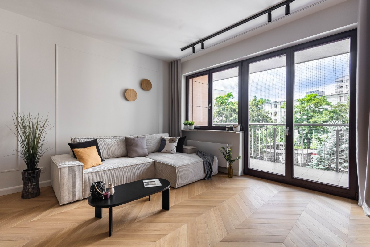 - Przestronny salon z jadalnią, doświetlony dużymi oknami z wyjściem na kształtny duży balkon