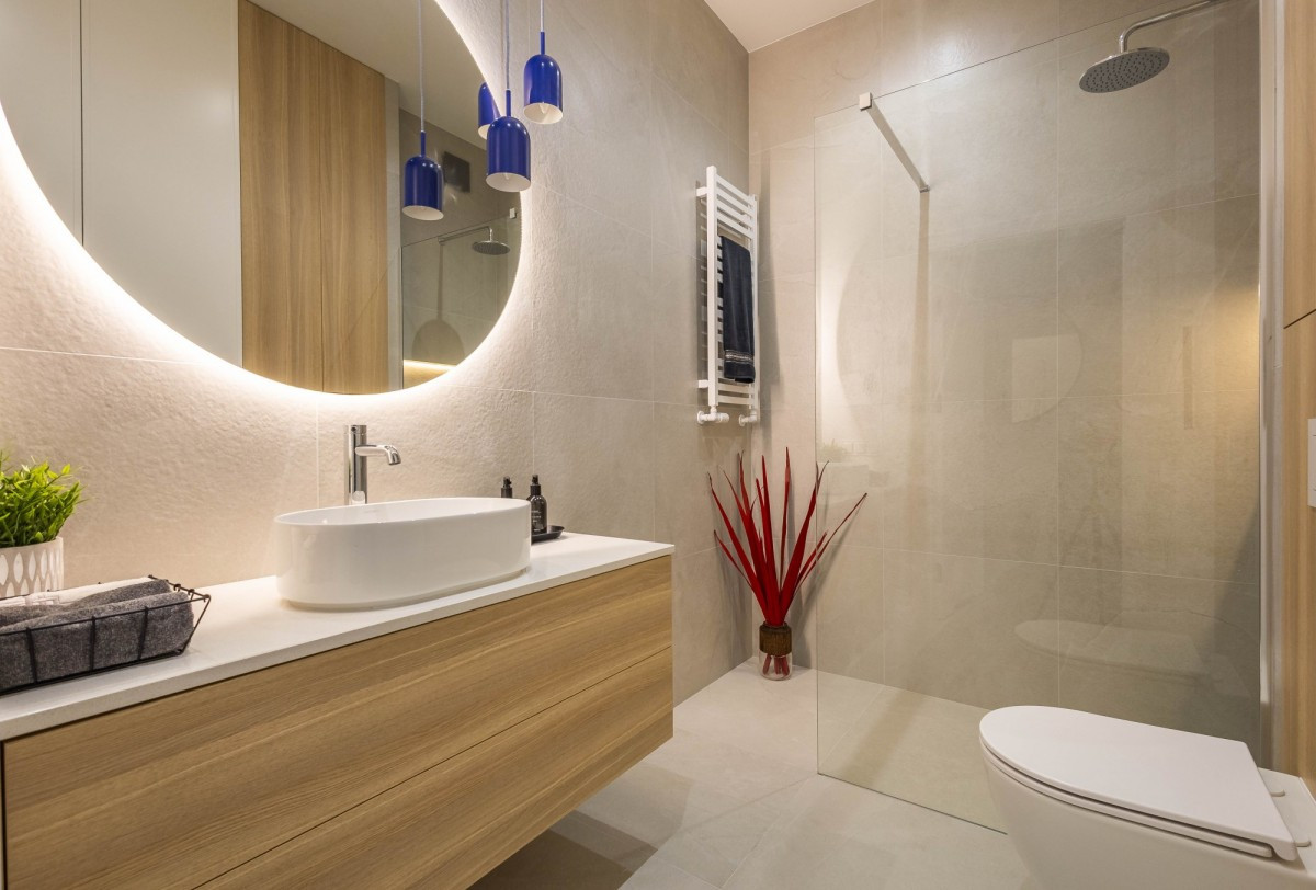 - łazienkę z dużym prysznicem typu walk in oraz zabudową na pralkę i suszarkę