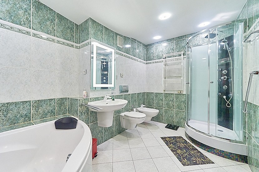 łazienka wyposażonej w prysznic jak i wannę oraz toaletę i bidet,