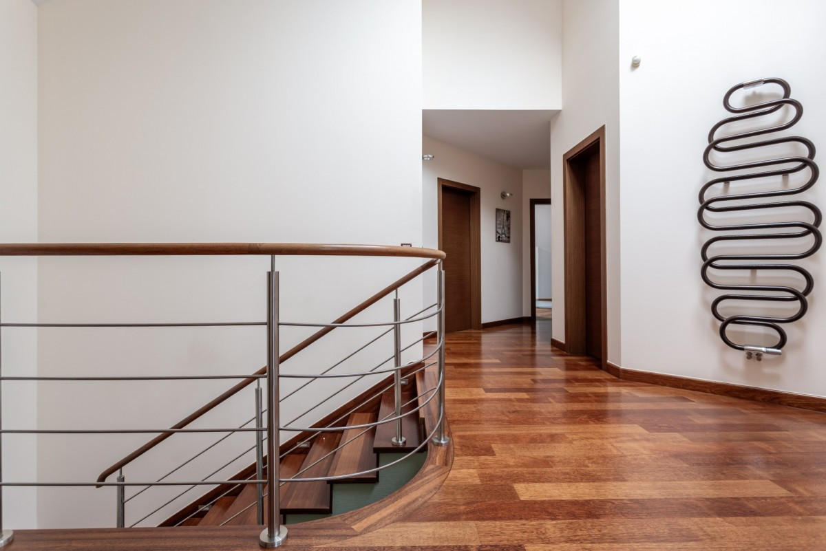 Na piętrze mieści się część prywatna. Znajdują się tu 4 sypialnie, w tym jedna z własną łazienką. Dodatkowo do dyspozycji mieszkańców pozostaje druga łazienka, pralnia z pomieszczeniem gospodarczym, garderoba oraz pokój z przeznaczeniem na siłownię.