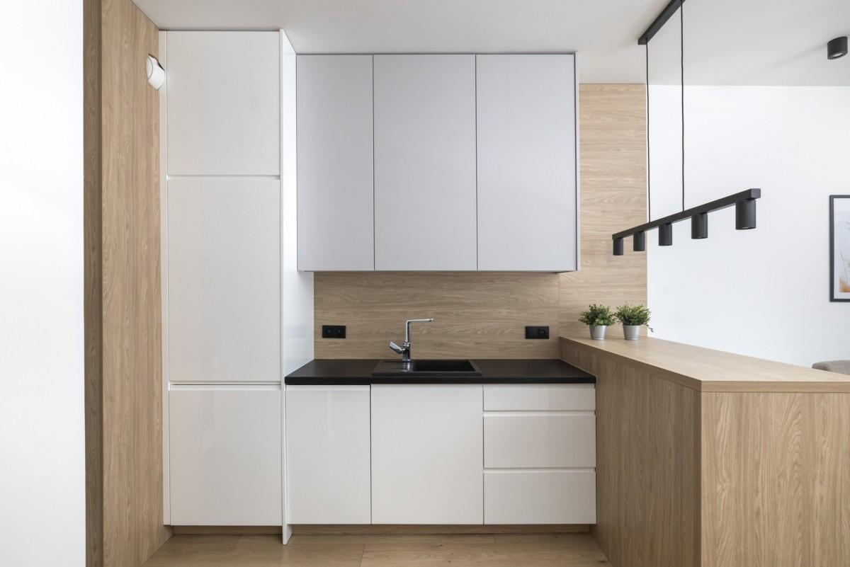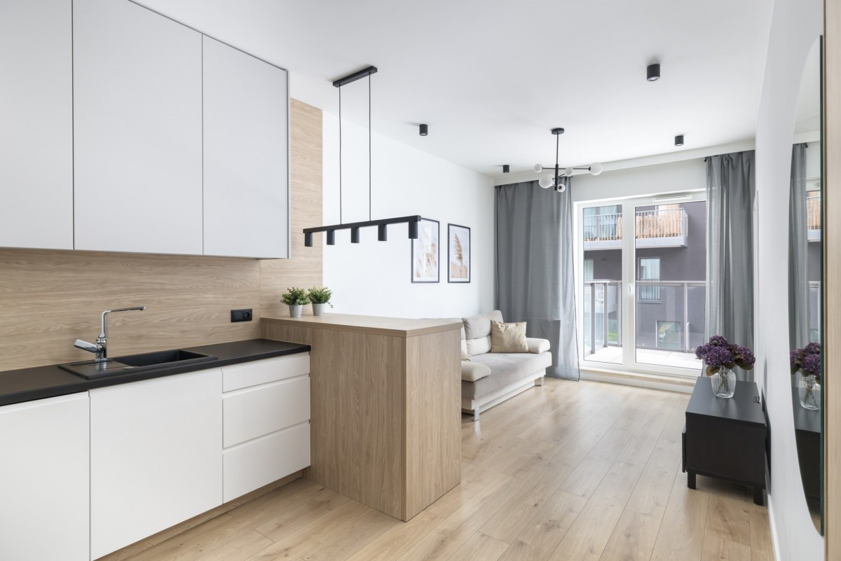salonu z aneksem kuchennym (ok. 19 m²) - wyposażonego w zabudowę kuchenną z pełnym zestawem AGD: zmywarkę, piekarnik, płytę indukcyjną, lodówko-zamrażarkę i okap. W części dziennej znajduje się wygodna sofa, stolik kawowy, telewizor oraz stół z krzesłami,