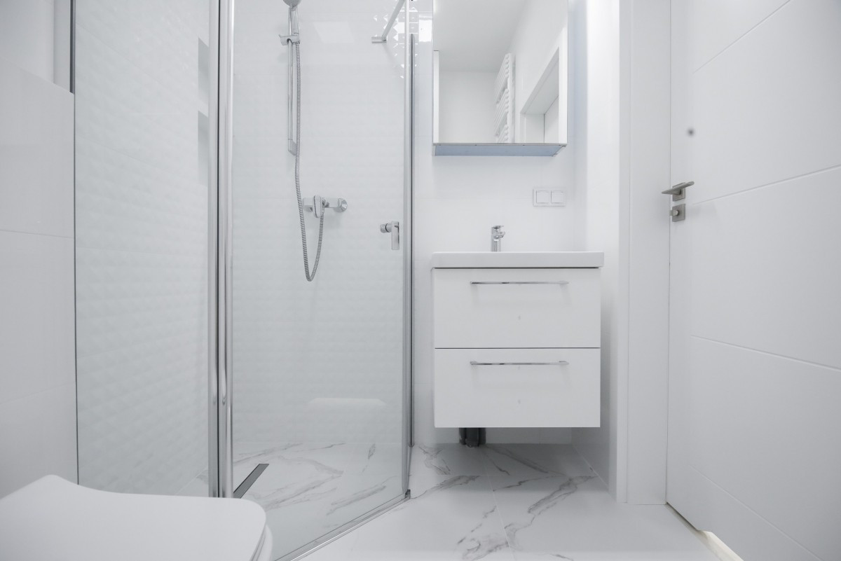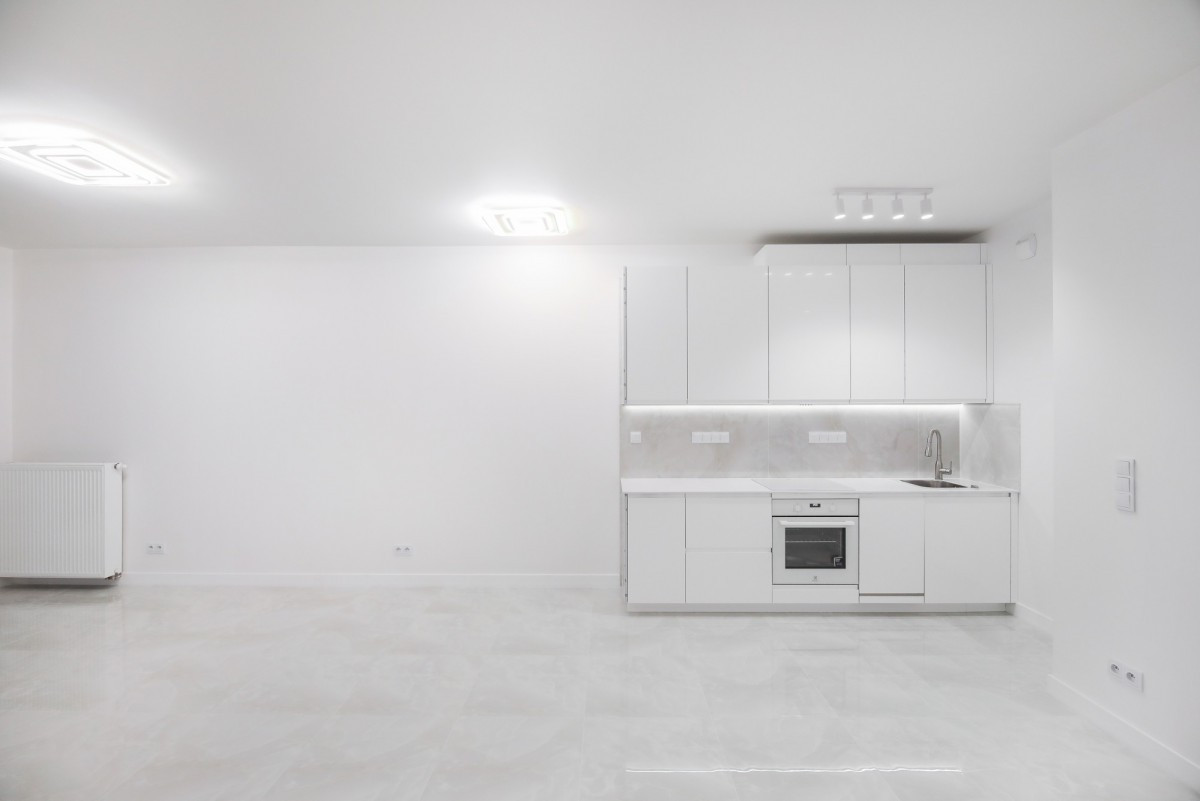 Nowoczesne studio o powierzchni 42 m2 składa się z pokoju z aneksem kuchennym oraz łazienki.