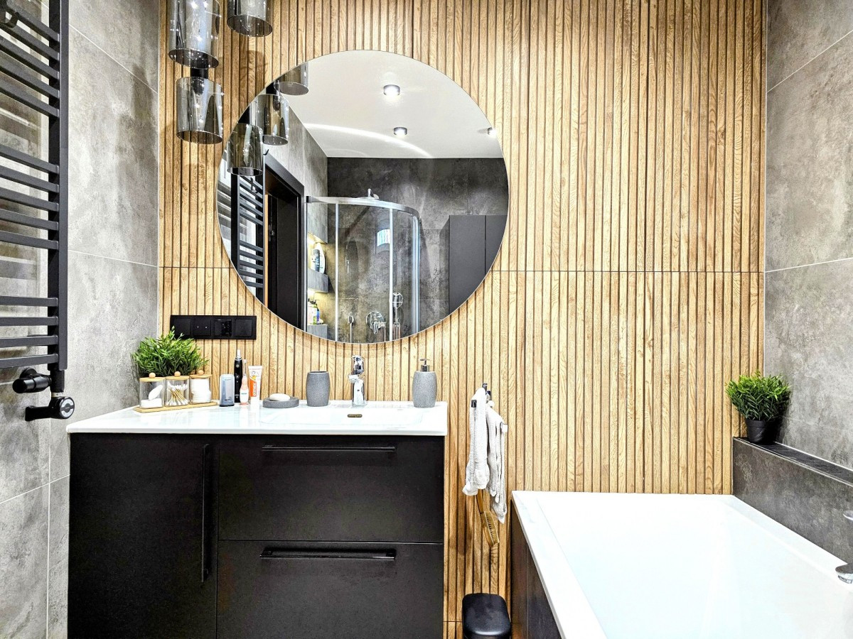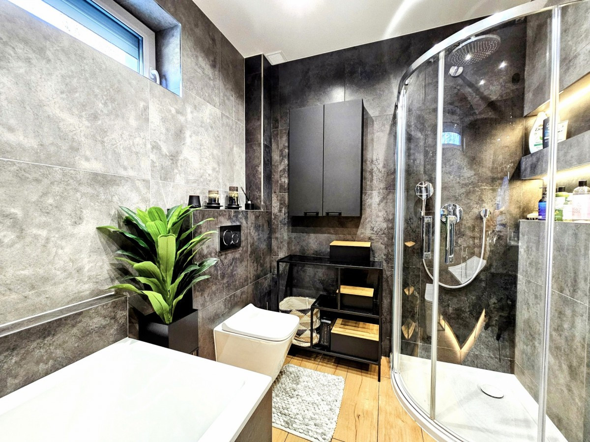 Mieszkanie ma nowoczesne wykończenie wnętrz o podwyższonym standardzie oraz posiada dwustronny układ stron świata.