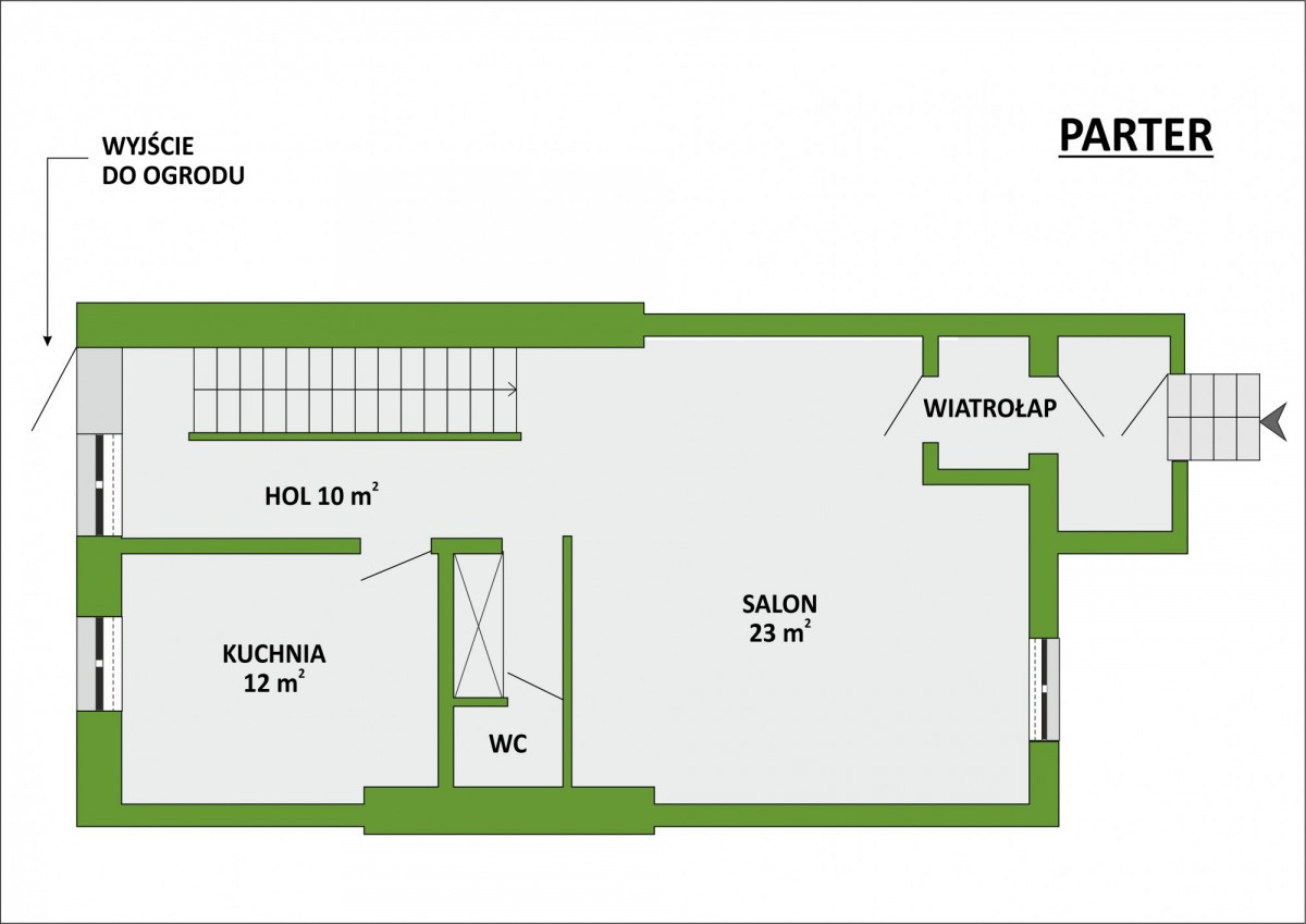 Salon 23m. Kuchnia 12m. WC 2m. Wiatrołap 3m. Hol 10m. Weranda 6m.
